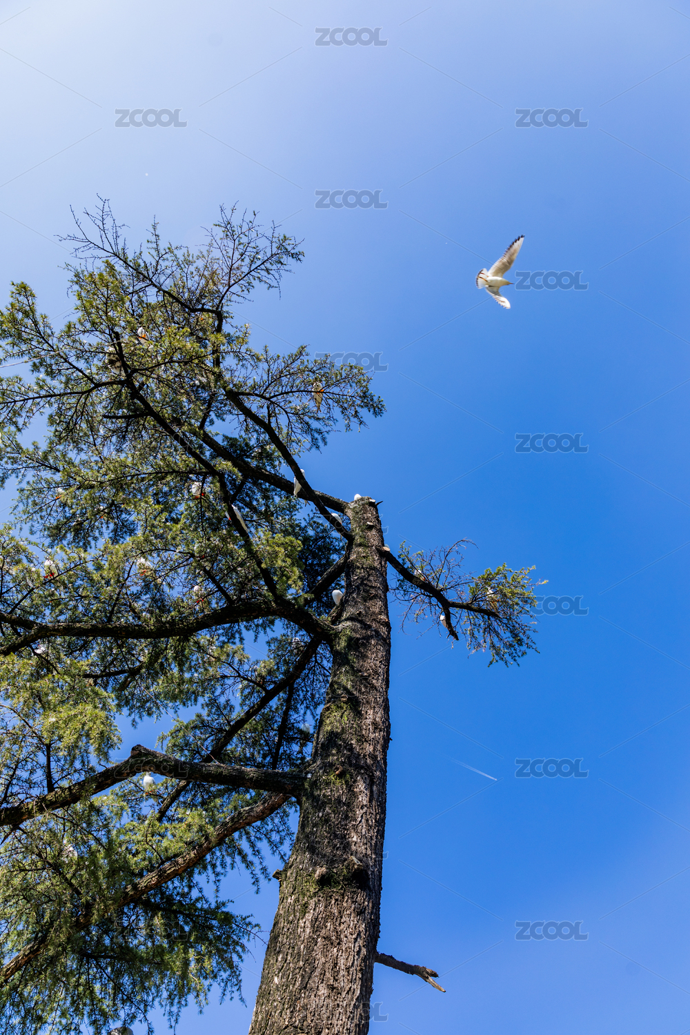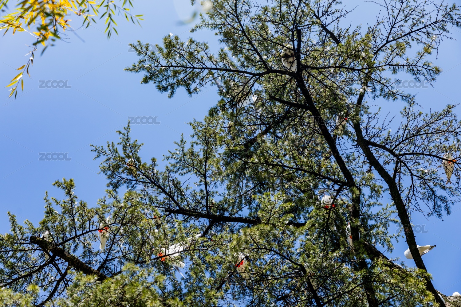 海鸥,红嘴鸥,松树,蓝天,枝头,栖息,群鸽,自然,鸟类,晴朗
