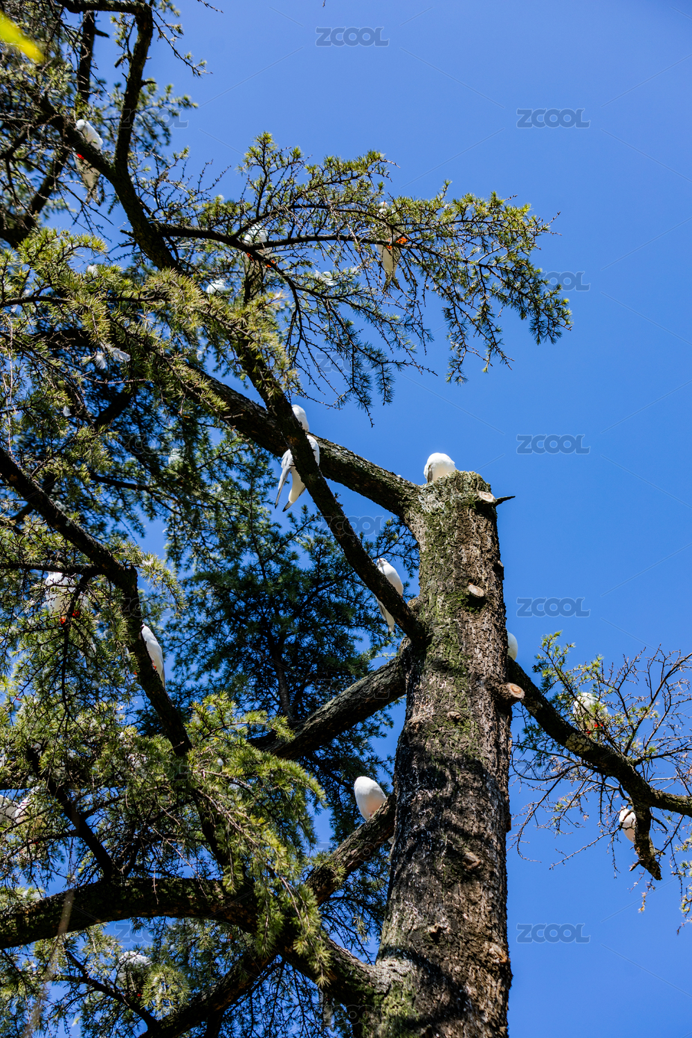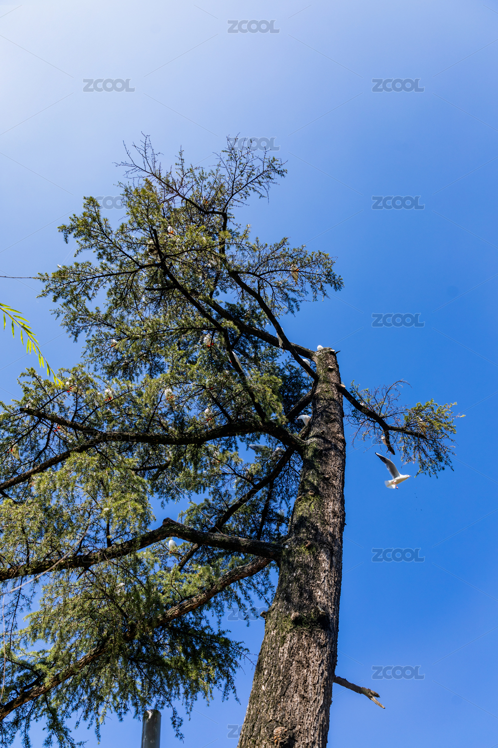 海鸥,红嘴鸥,松树,蓝天,枝头,栖息,群鸽,自然,鸟类,晴朗