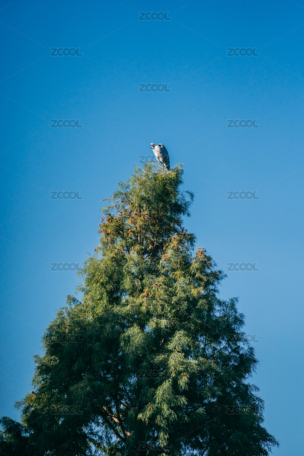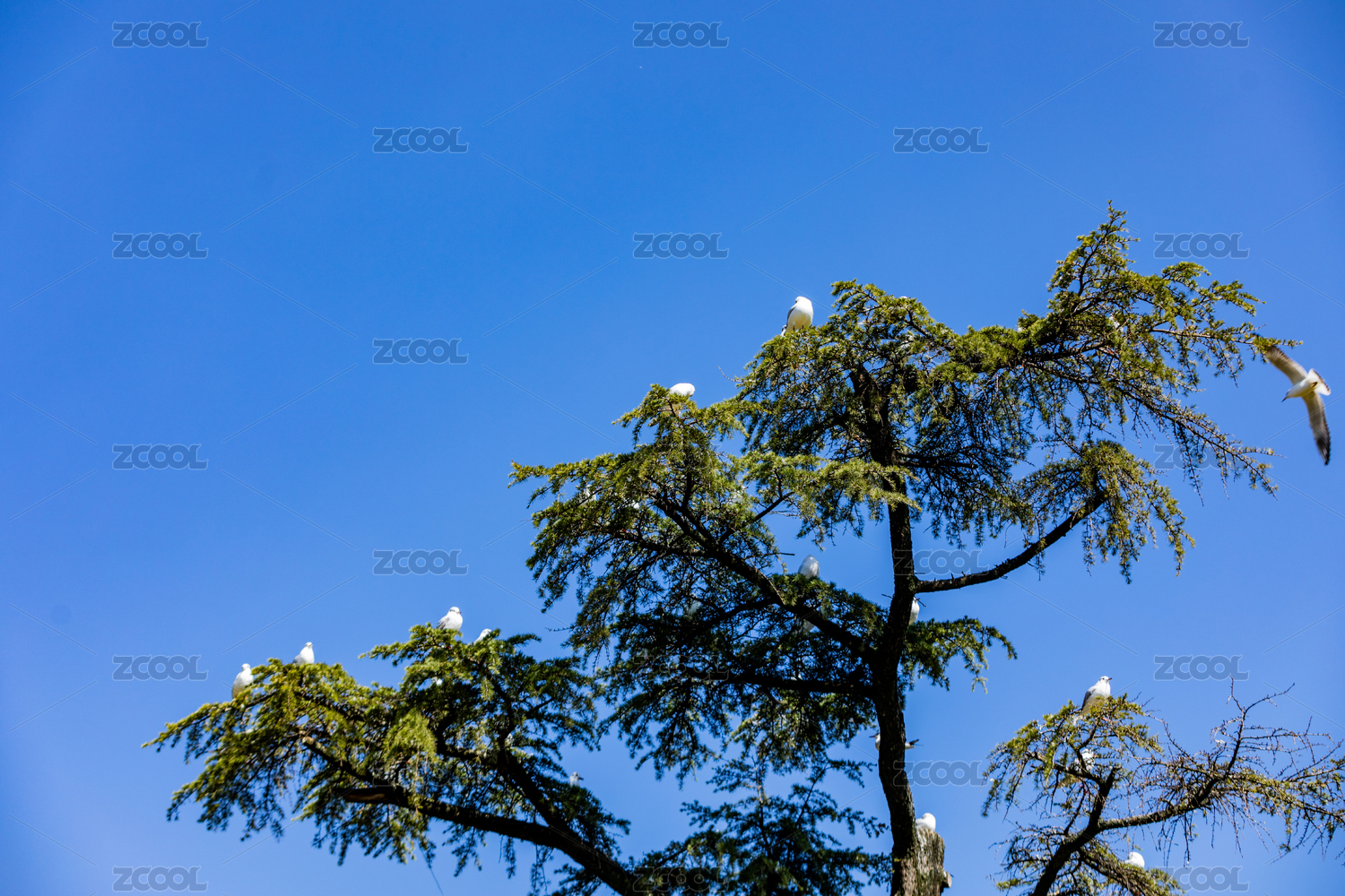 海鸥栖息松树枝头