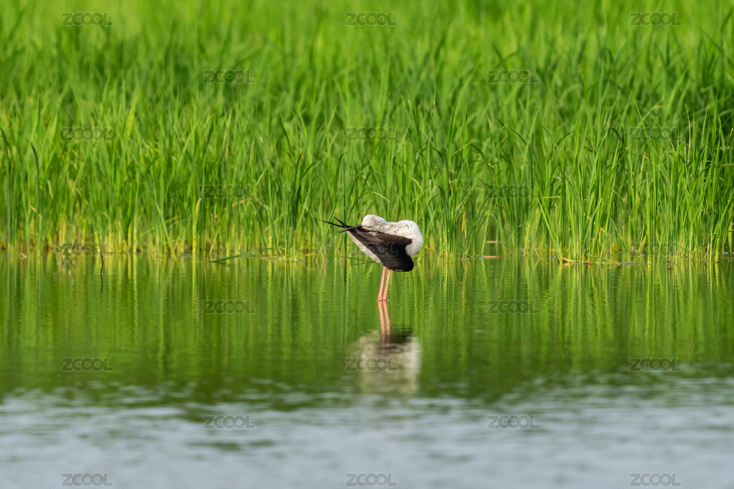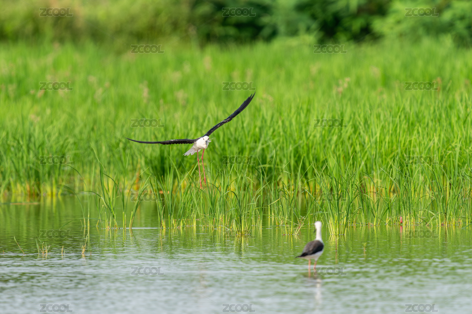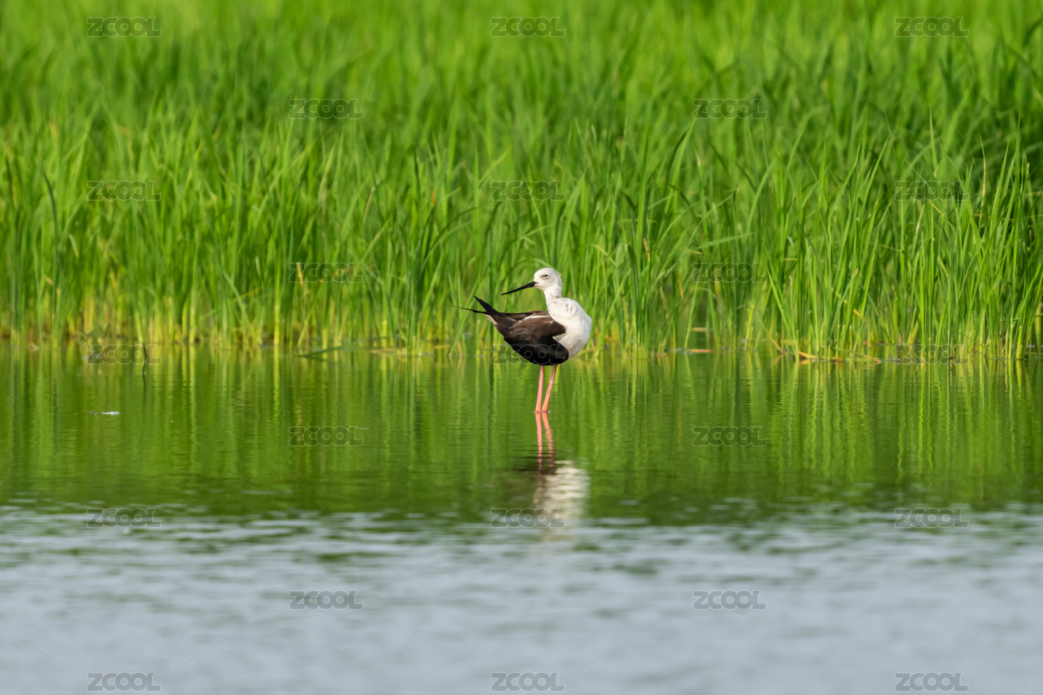 黑翅长脚鹬鸟在湿地中栖息觅食