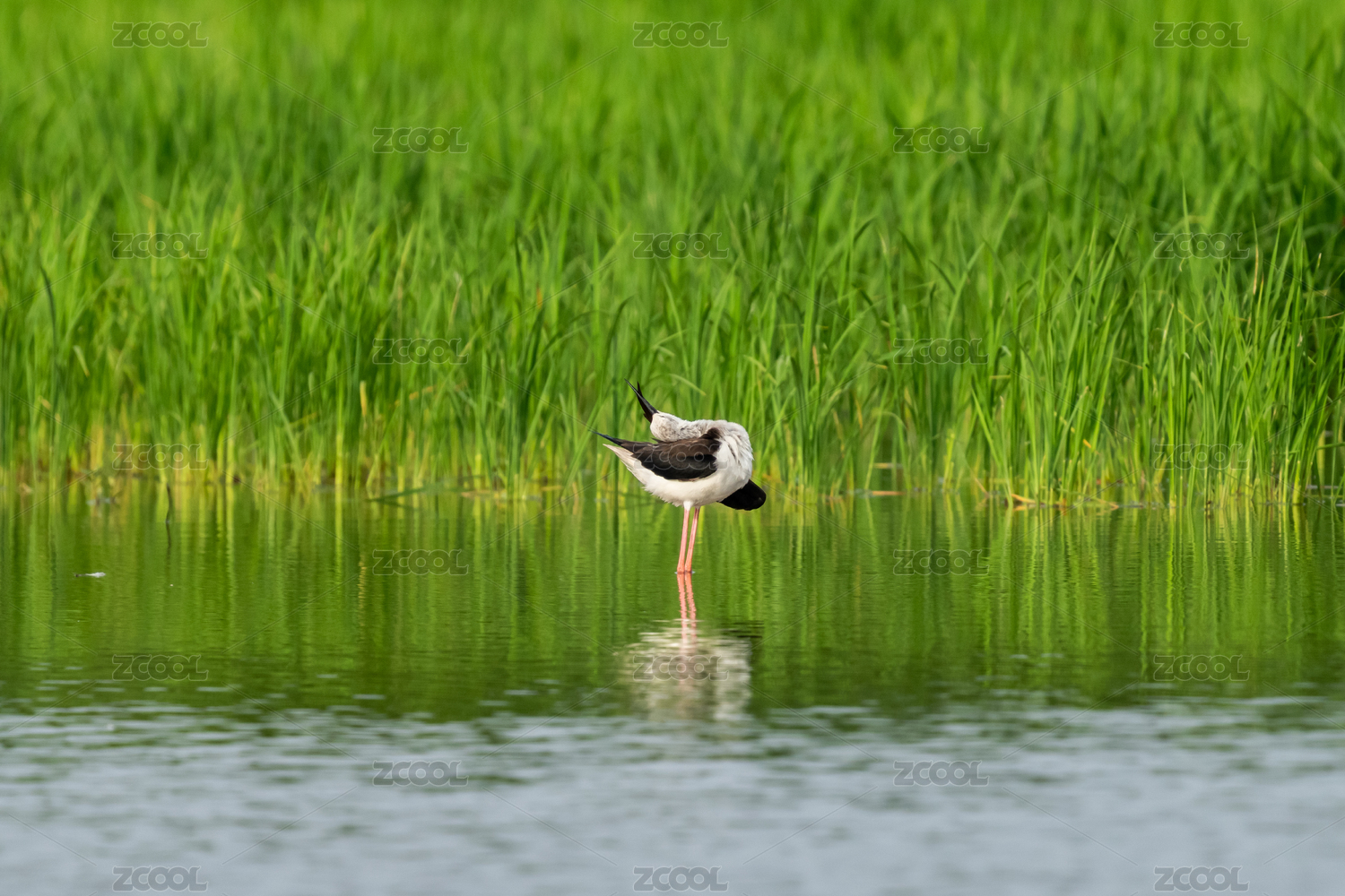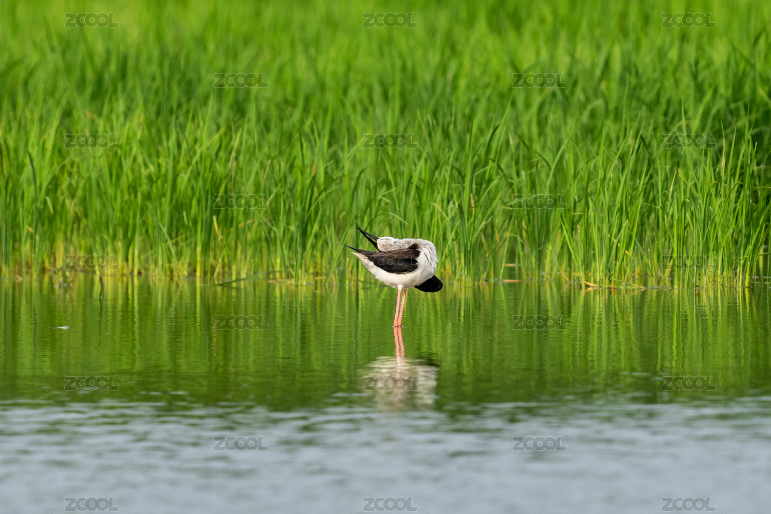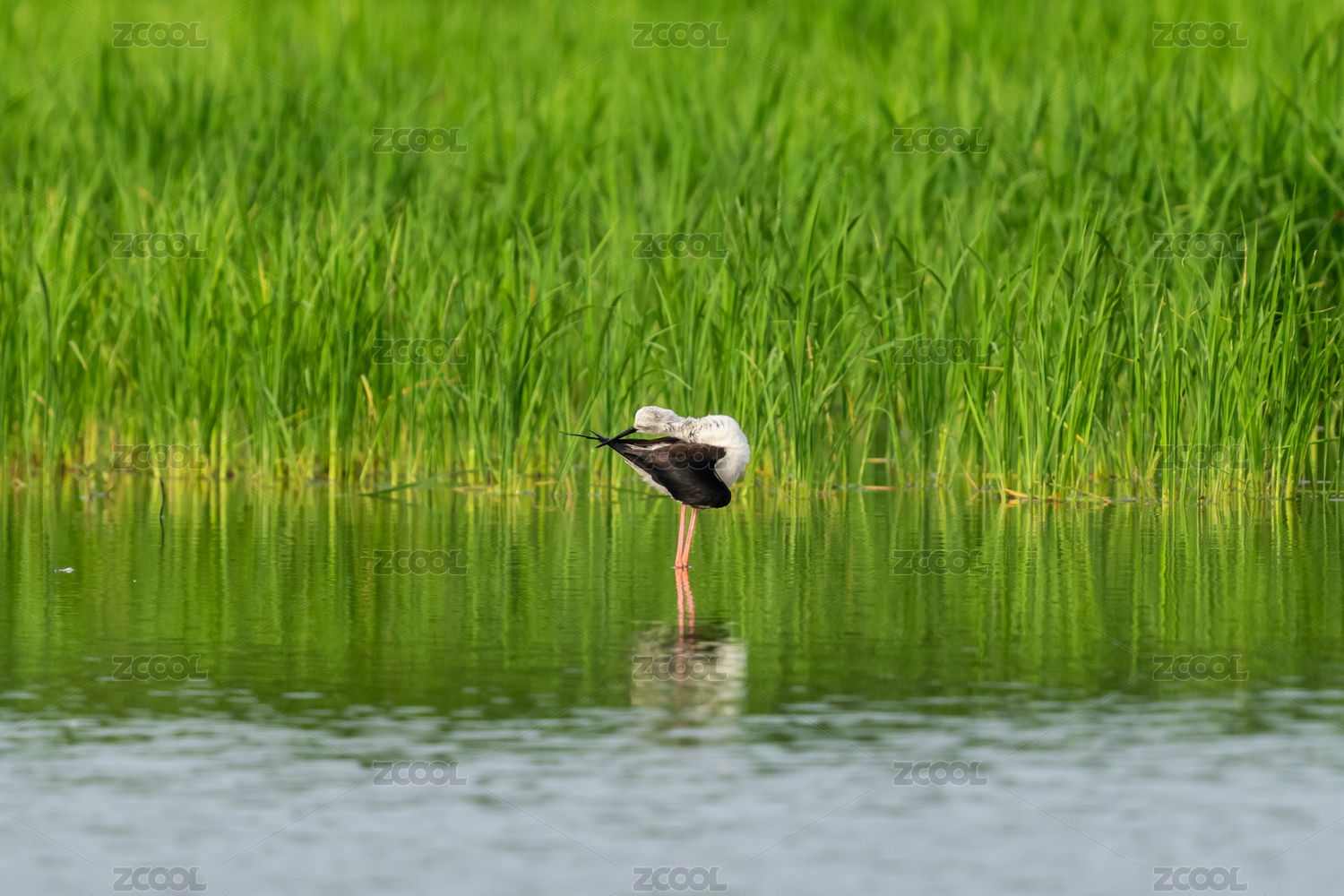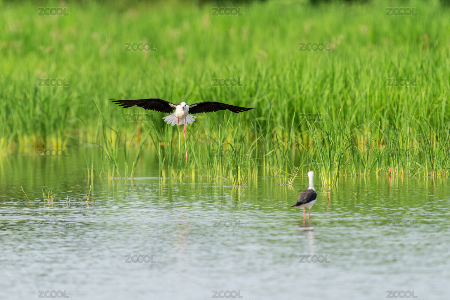 黑翅长脚鹬鸟在湿地中栖息觅食
