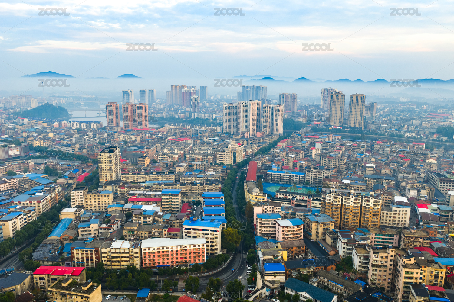 航拍湖北咸宁赤壁市城市清晨风光