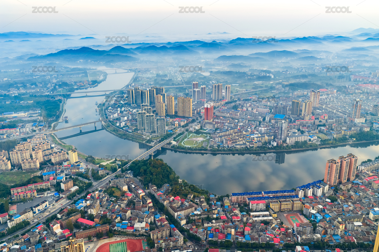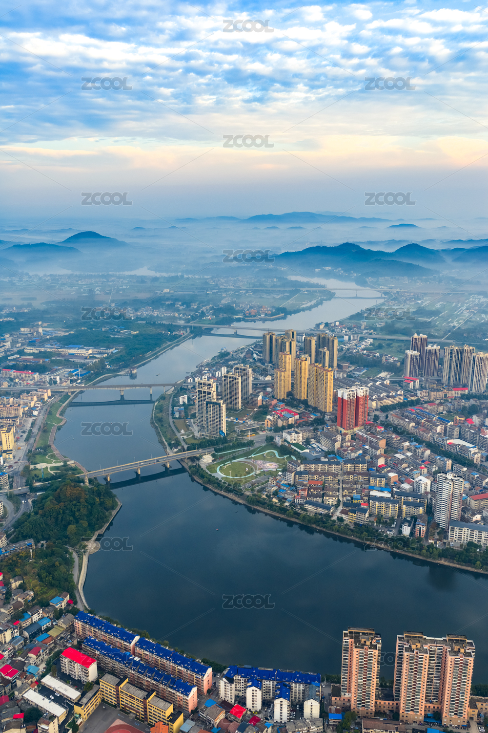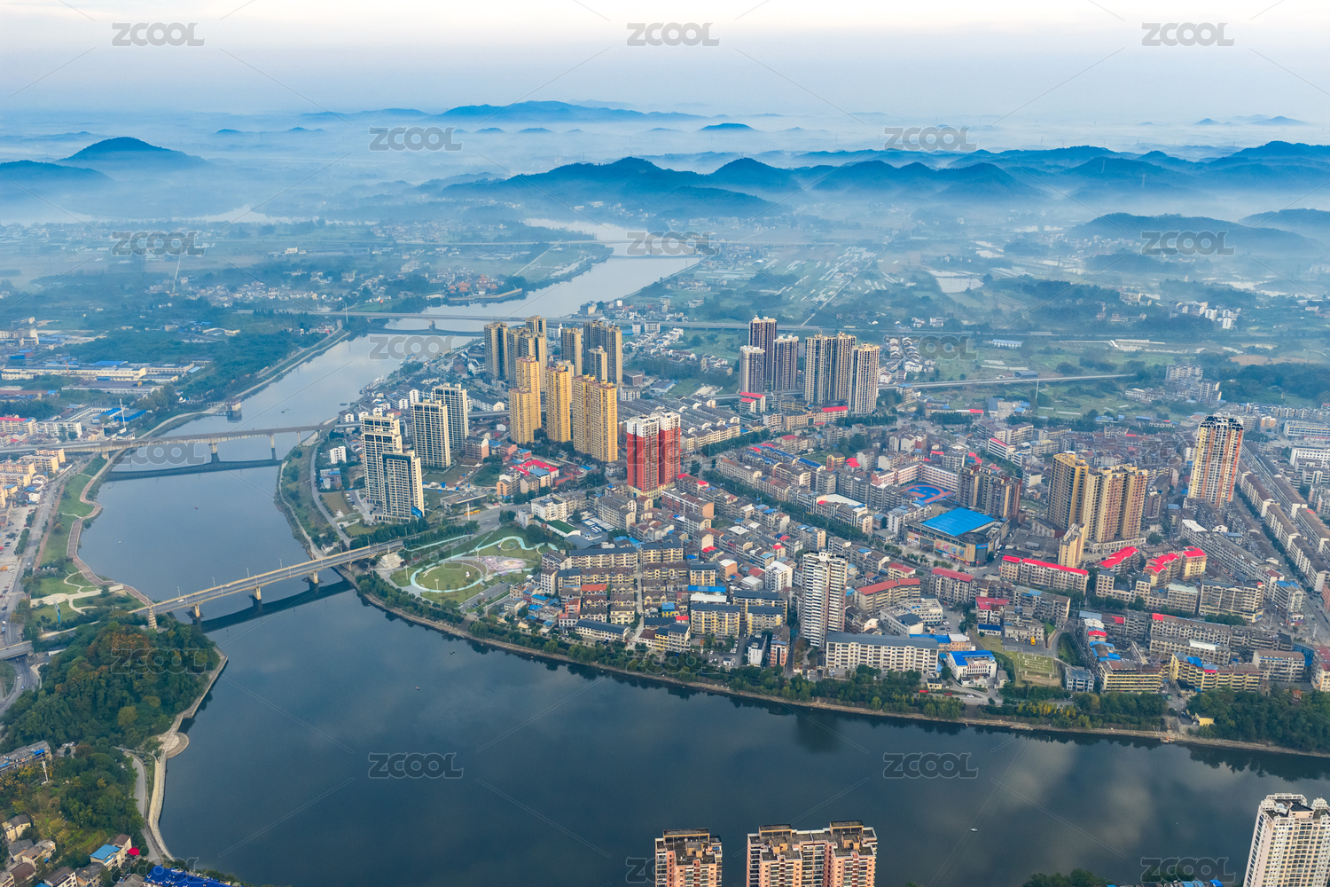 中国湖南溆浦县城建筑云雾缭绕高空航拍图