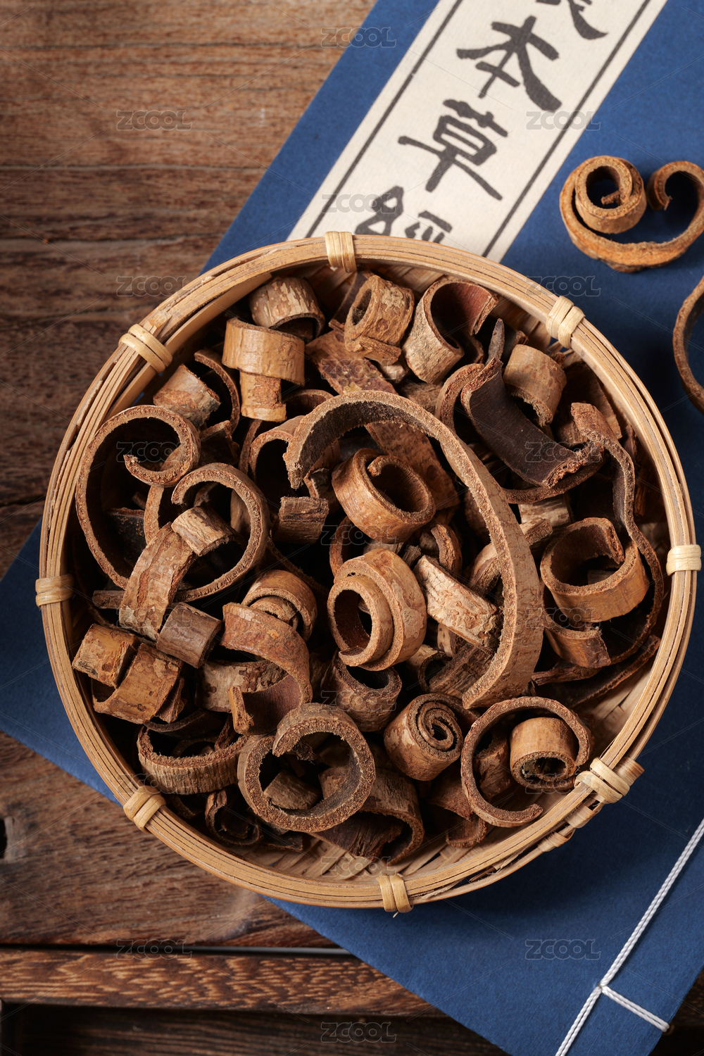 桌面上的盘子里的干爽的秦皮