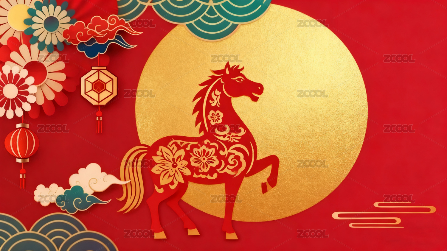 可爱,中国风,马年,马,插画,平面,剪纸风,2026,花朵,剪纸