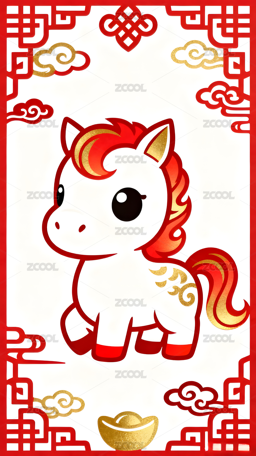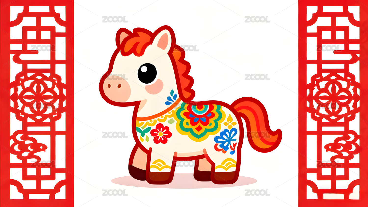 可爱,中国风,马年,马,插画,平面,剪纸风,2026,花朵,剪纸