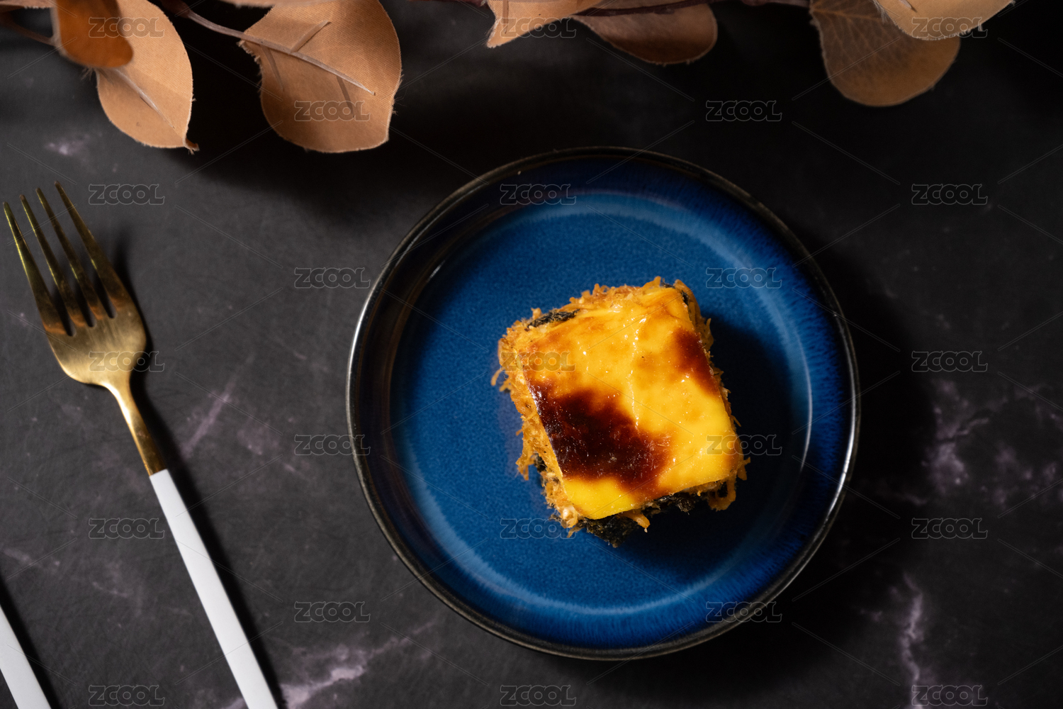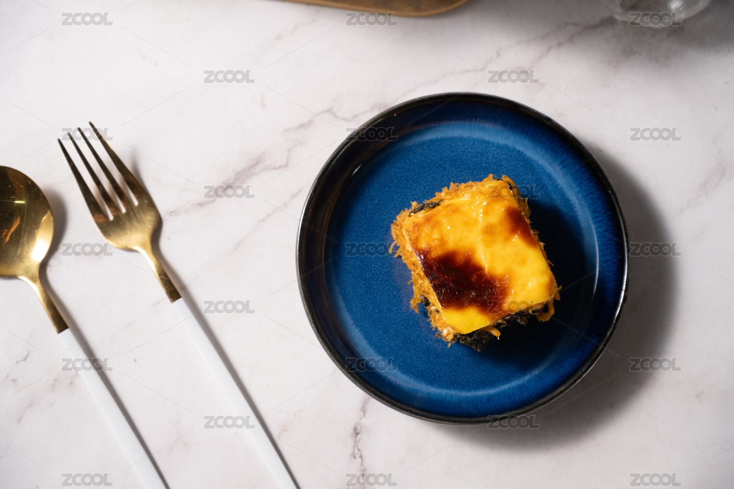 桌面上的盘子里的美味可口的芝士肉松蛋糕