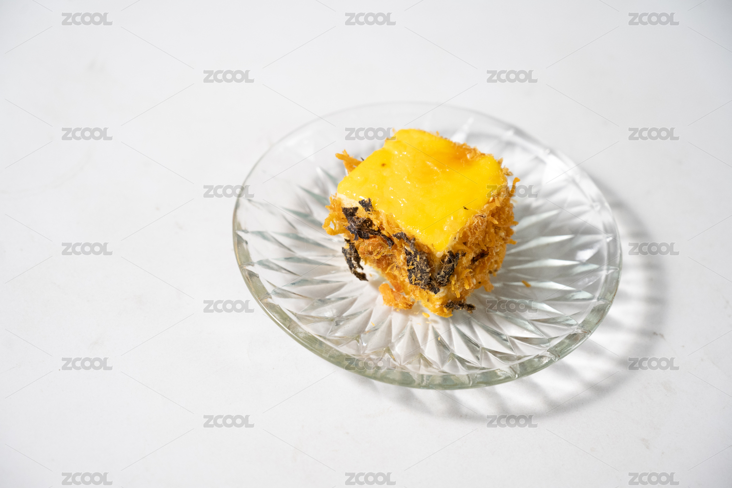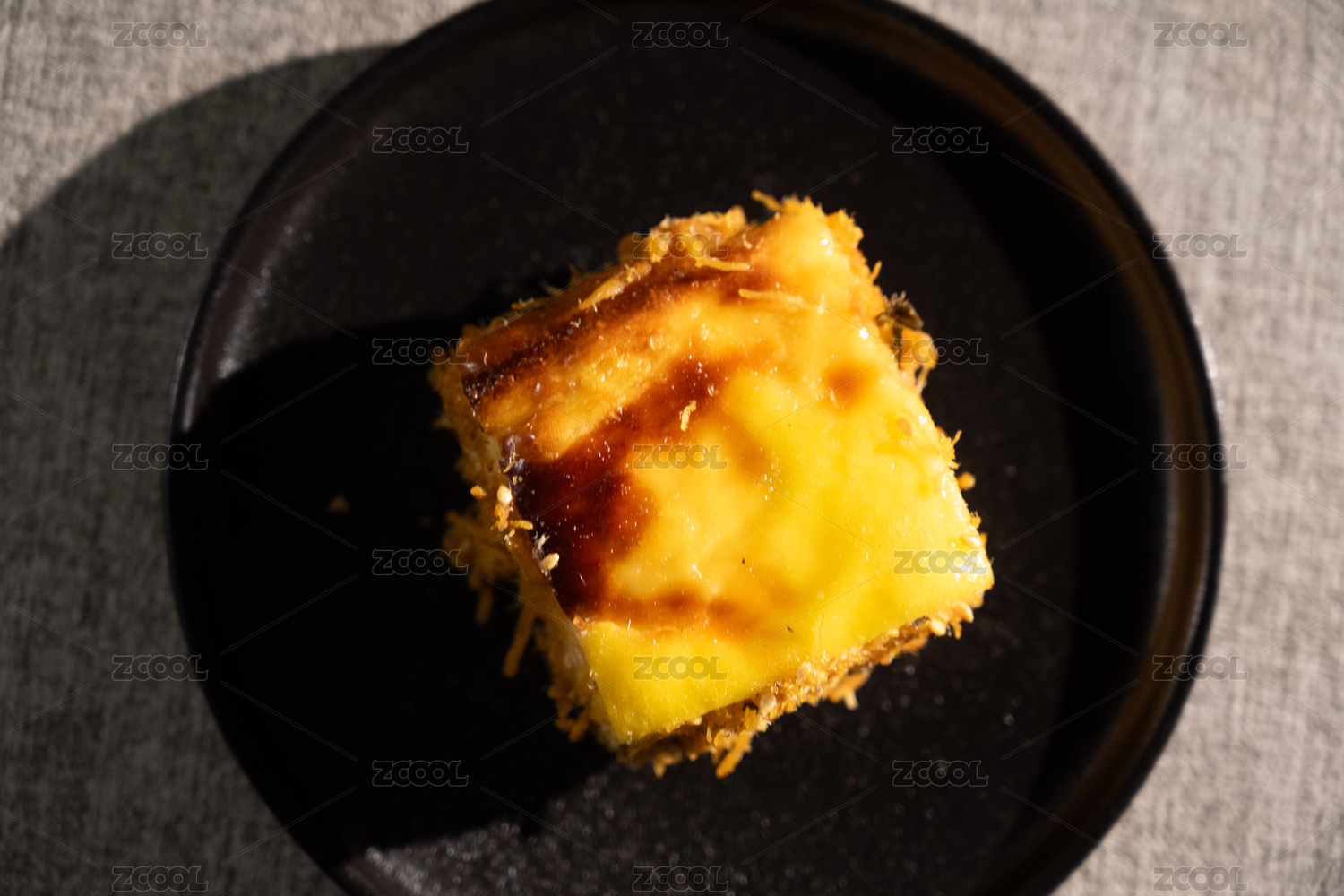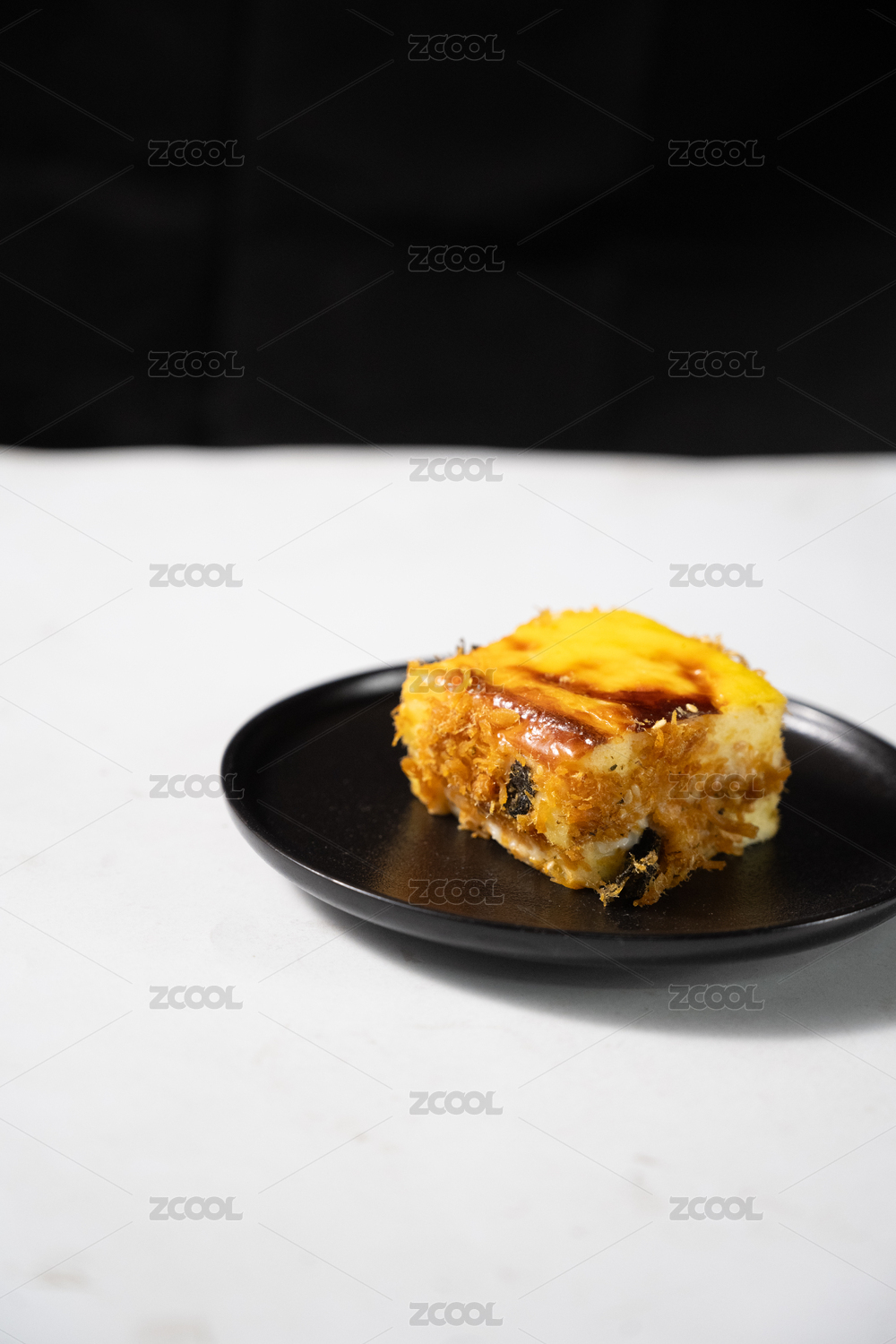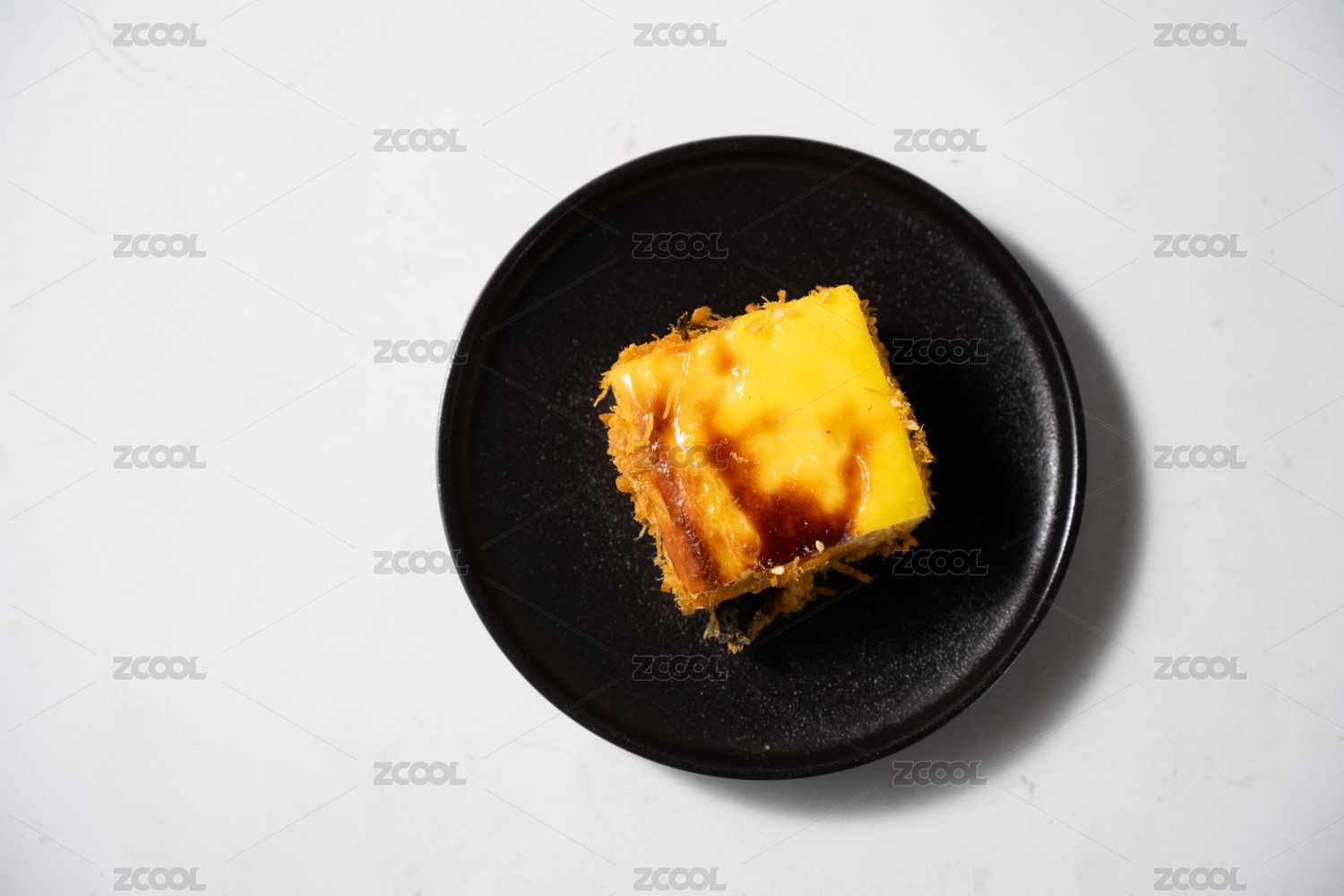 桌面上的盘子里的美味可口的芝士肉松蛋糕