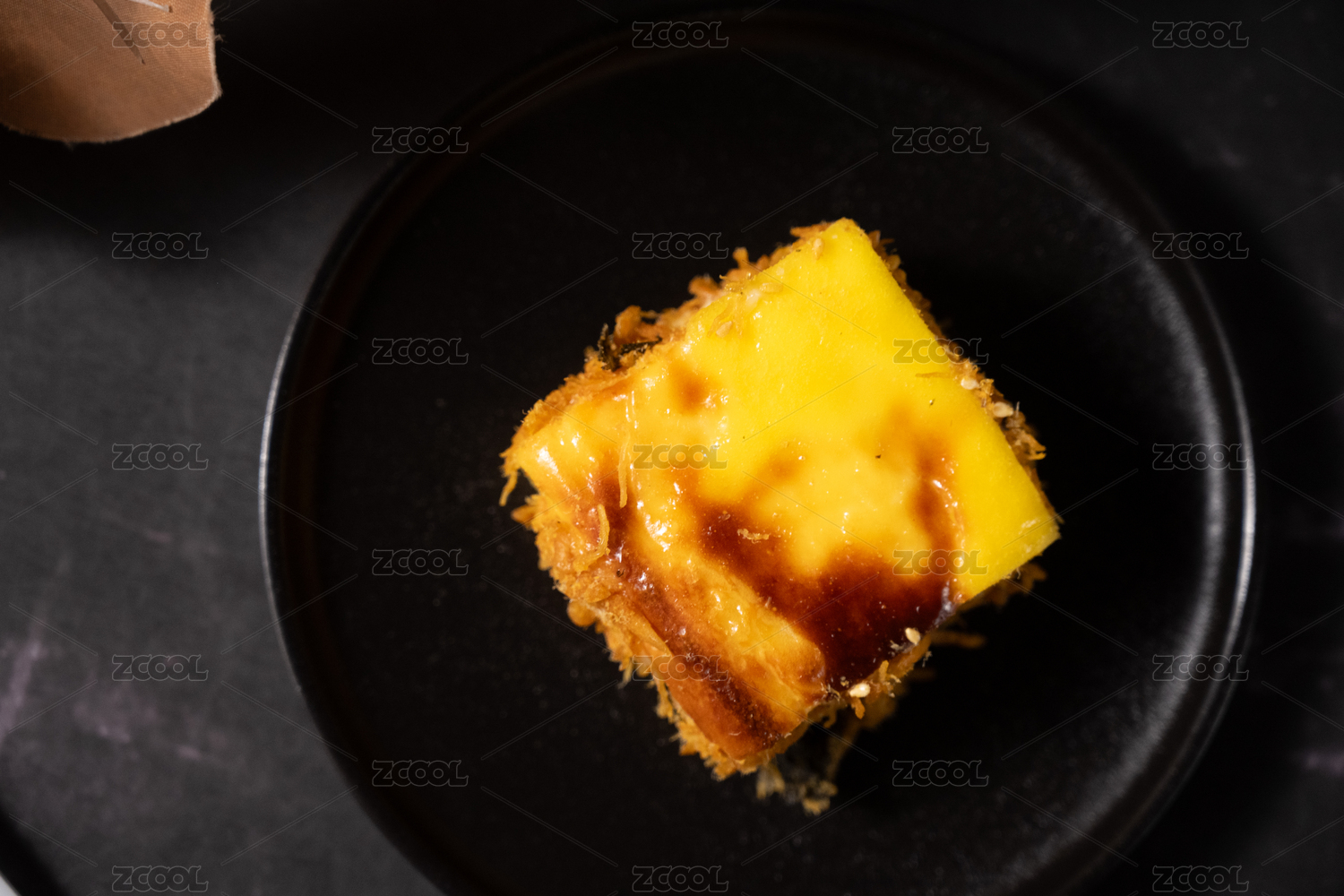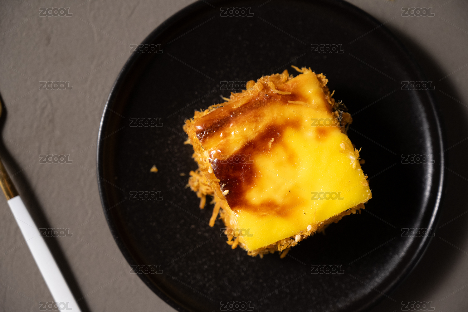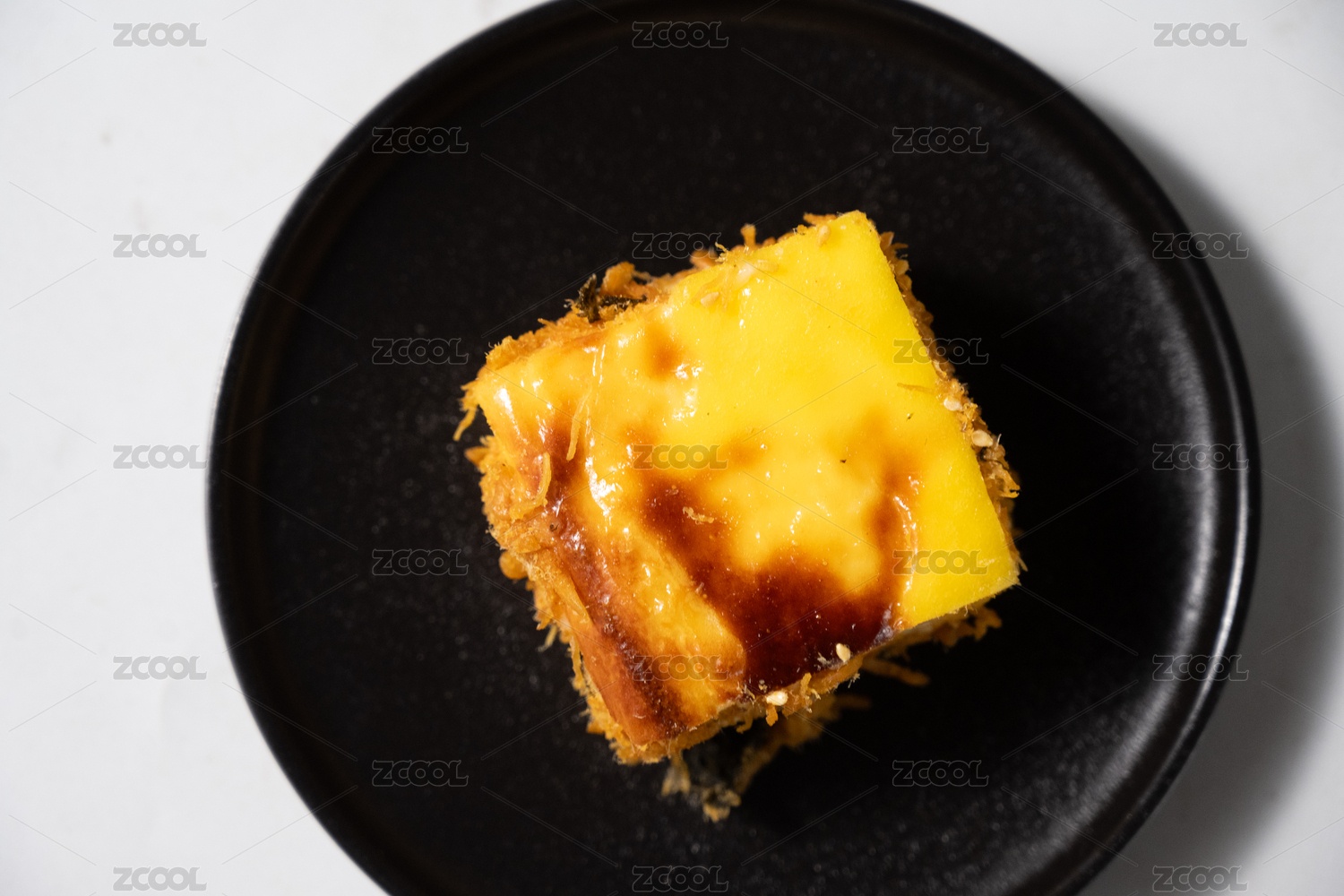 桌面上的盘子里的美味可口的芝士肉松蛋糕
