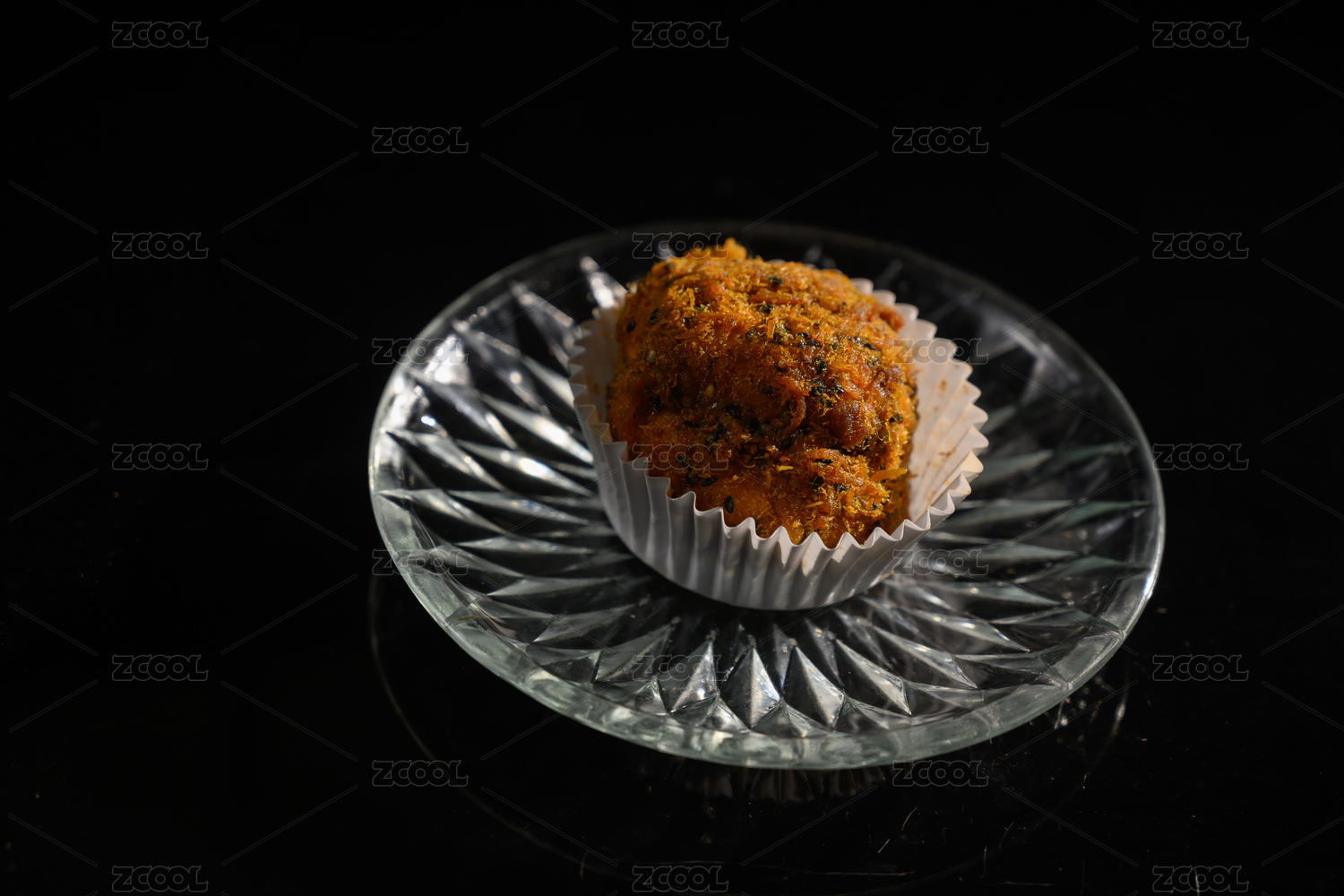 桌面上的盘子里的美味可口的芝士肉松蛋糕