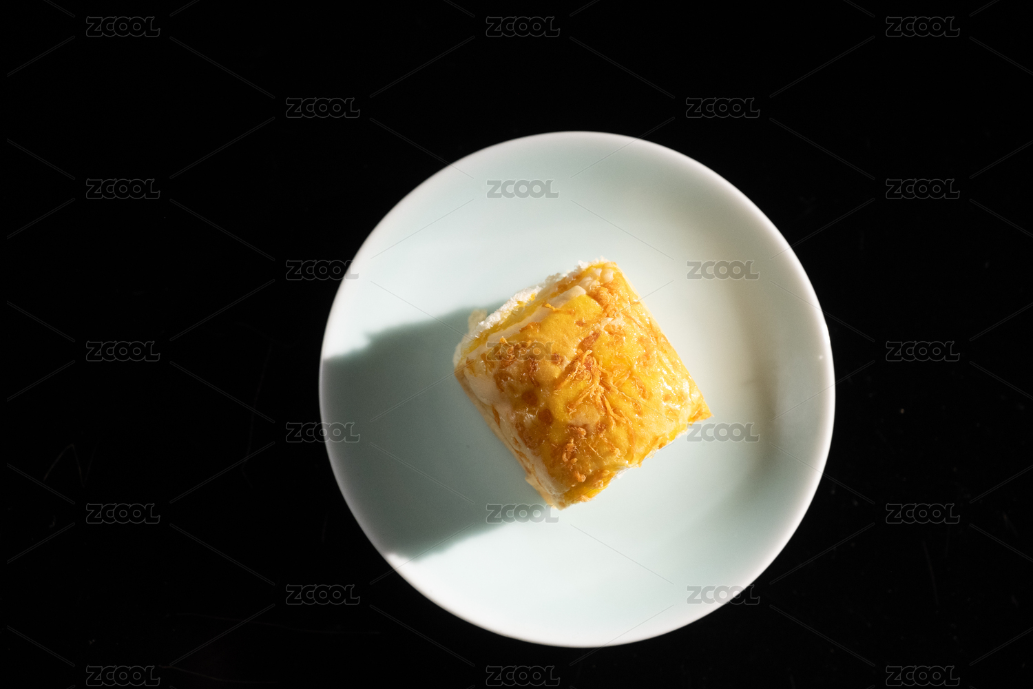 桌面上的盘子里的美味可口的芝士肉松蛋糕