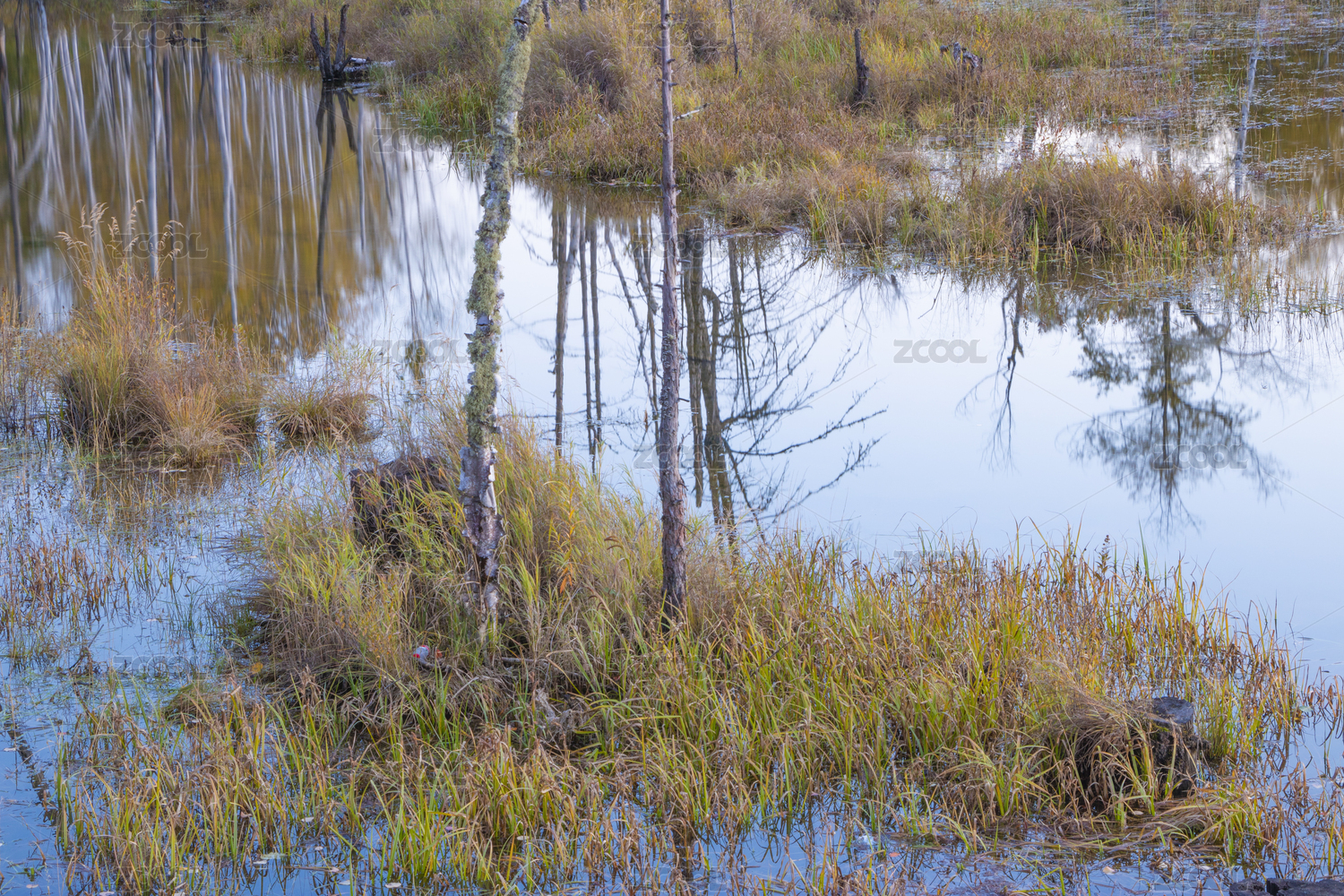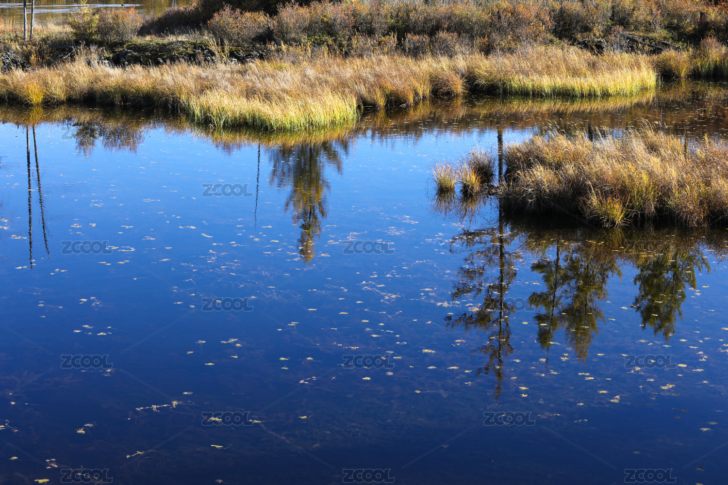 金黄色的森林植物和湖泊中的倒影蓝天白云