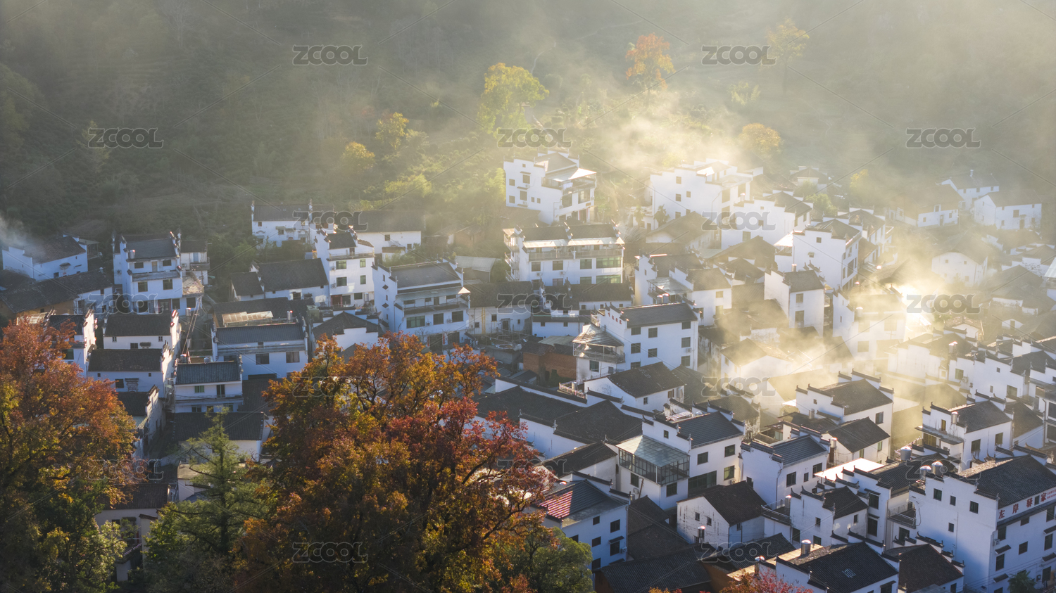 航拍江西婺源石城徽派建筑秋色枫叶村庄日出