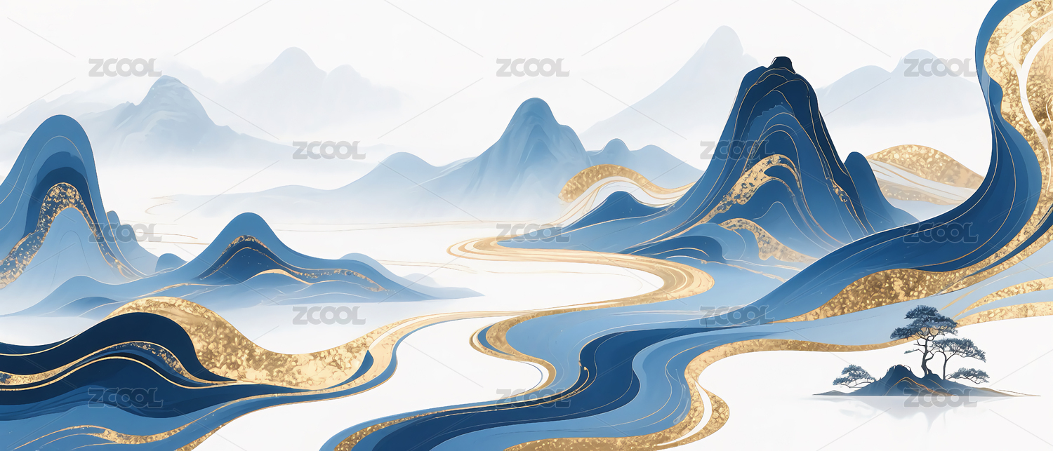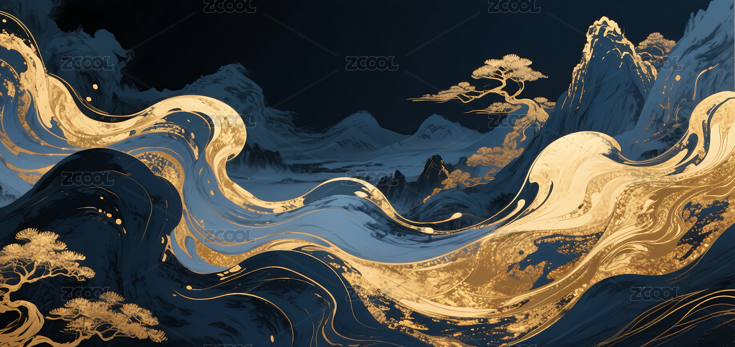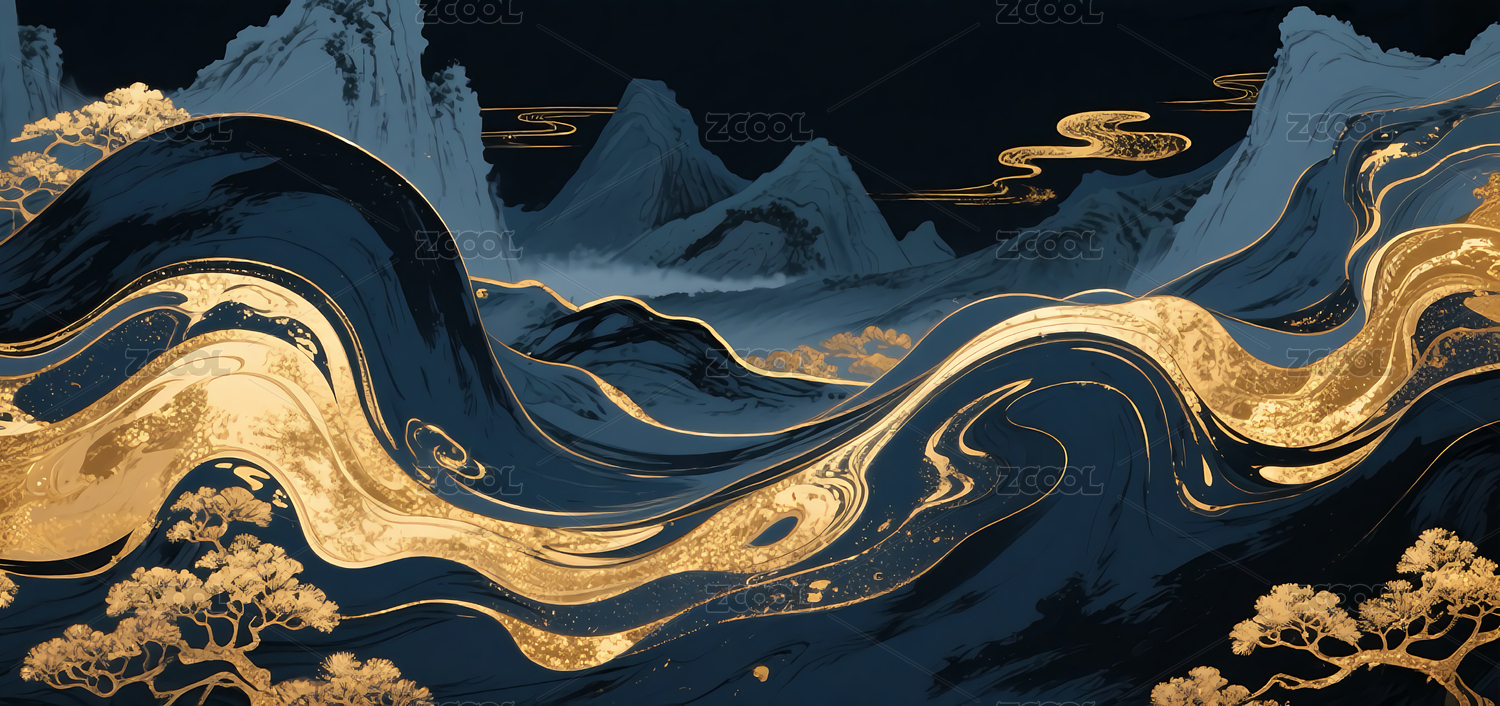 国风抽象鎏金流动山水背景