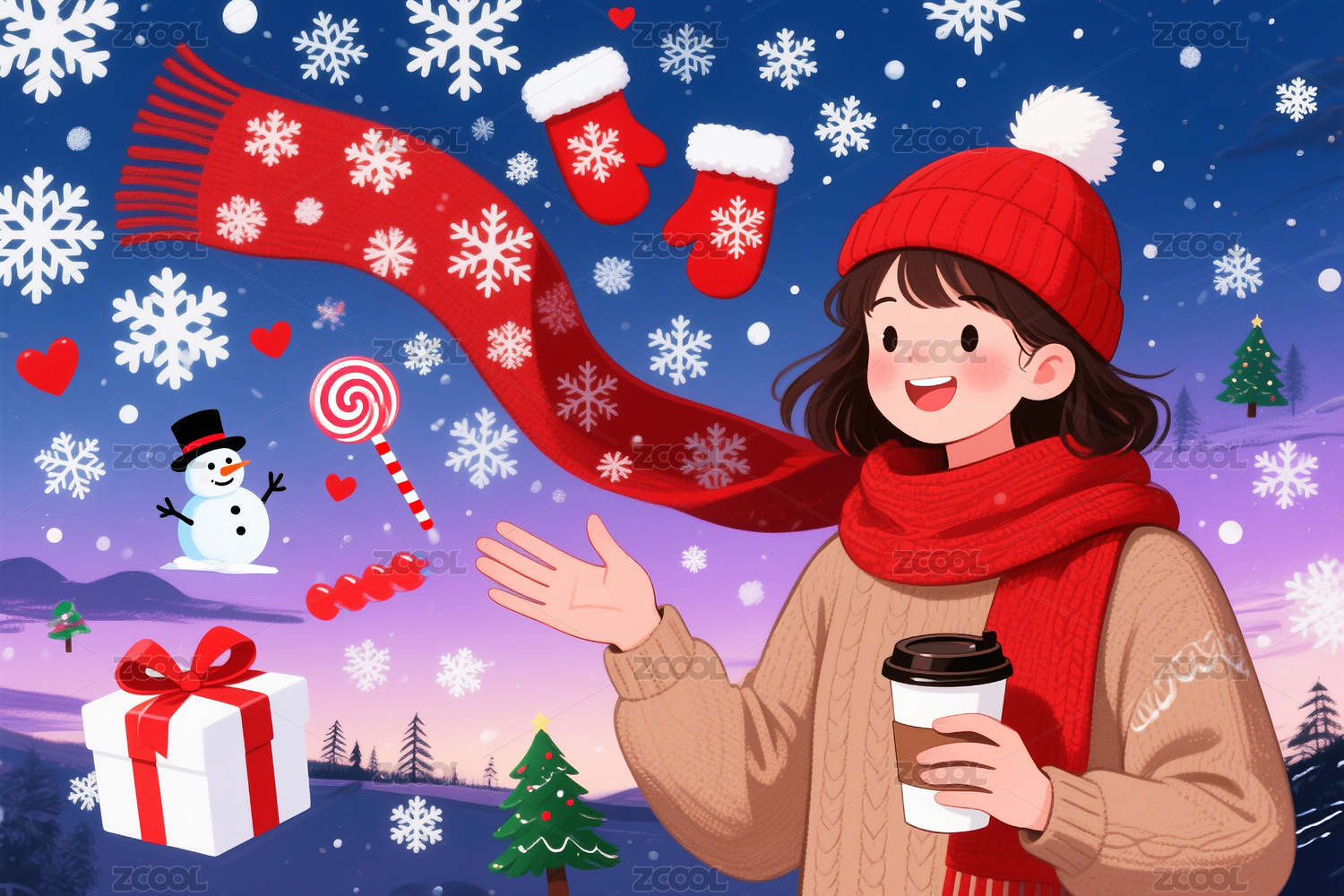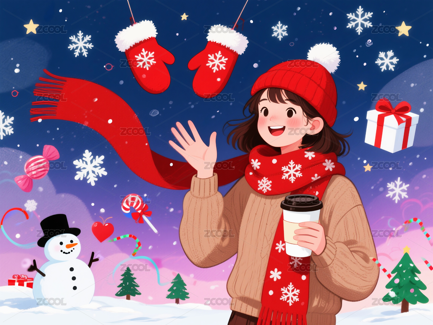 冬季,节日,小女孩,红色围巾,咖啡杯,雪人,圣诞手套,礼物盒,糖果,星星