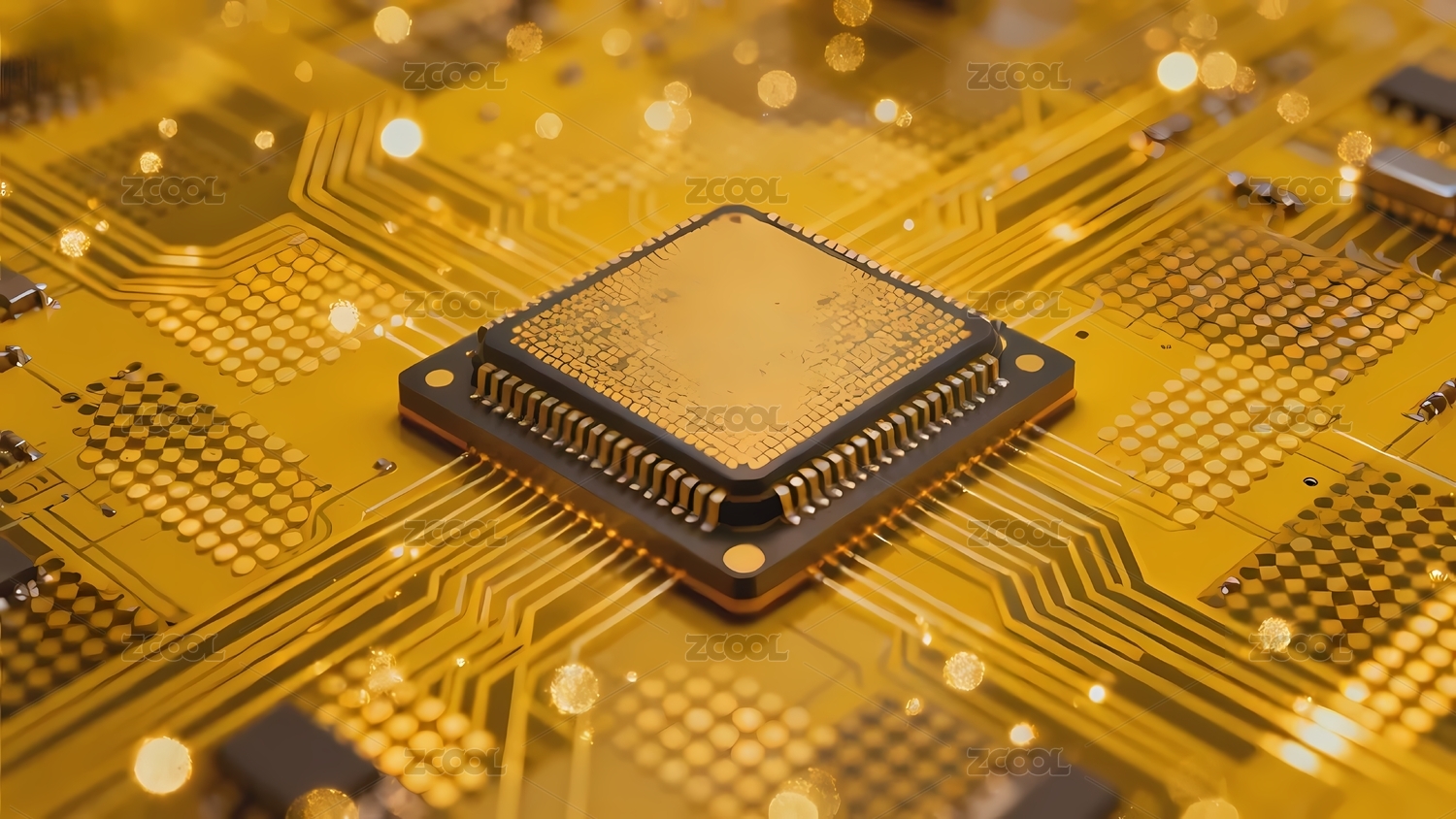 金色电路板上的芯片特写