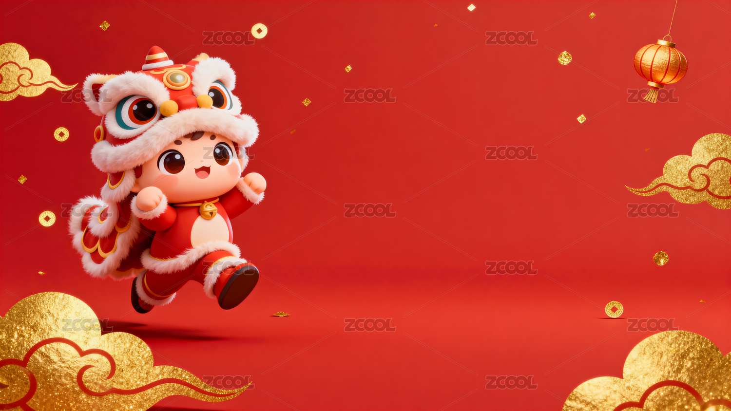 节日喜庆场景中的舞狮与小马马年喜庆的场景
