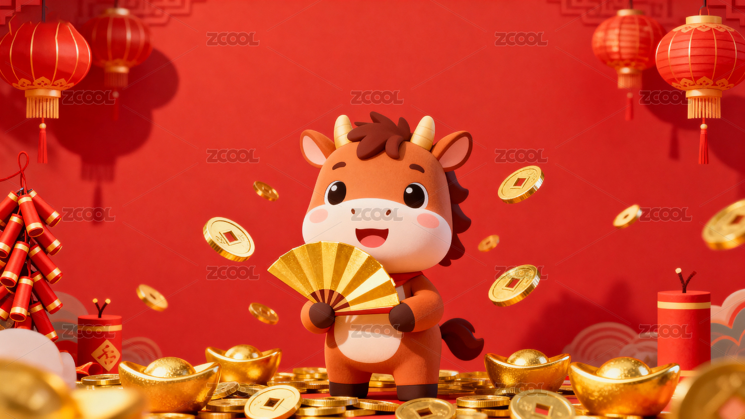 春节,喜庆,小牛,福字,红包,金元宝,鞭炮,灯笼,烟花,传统服饰