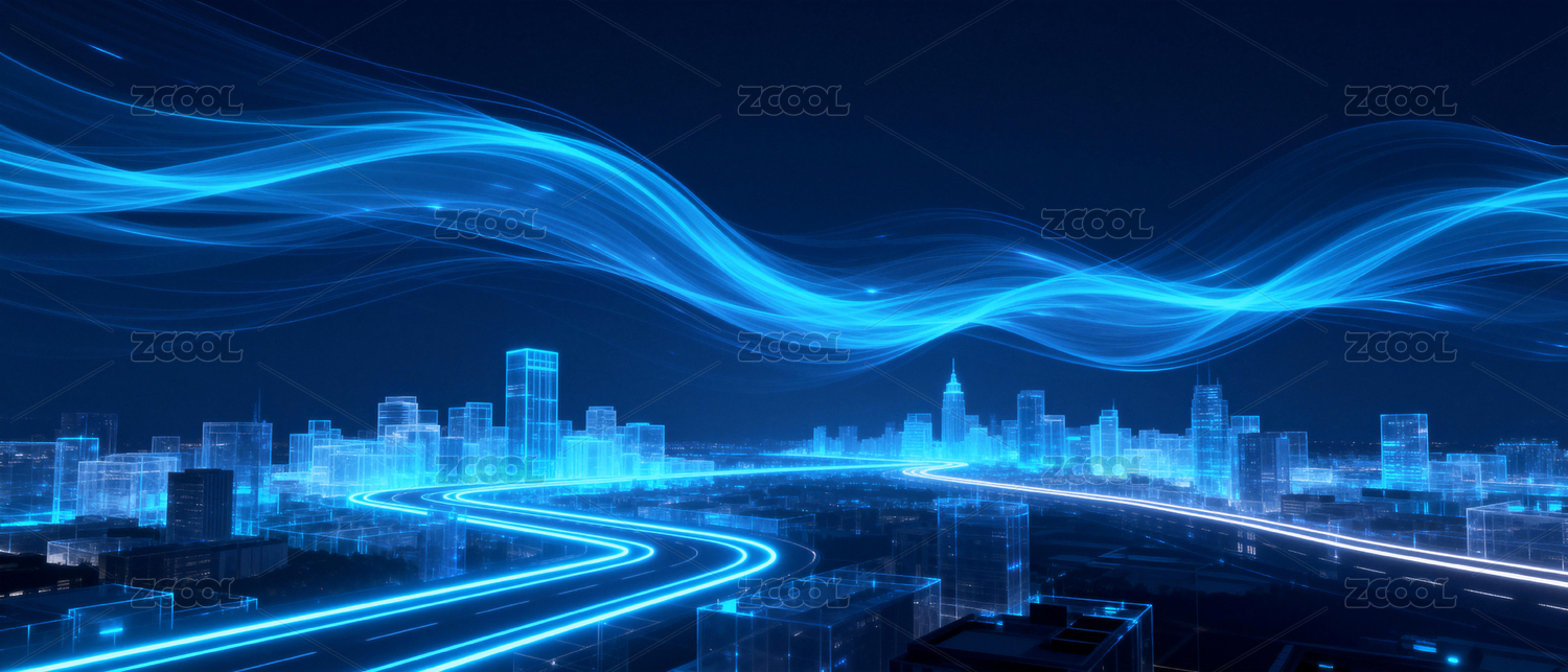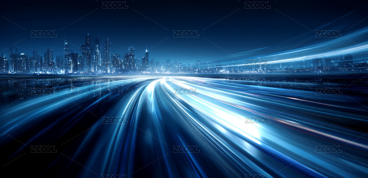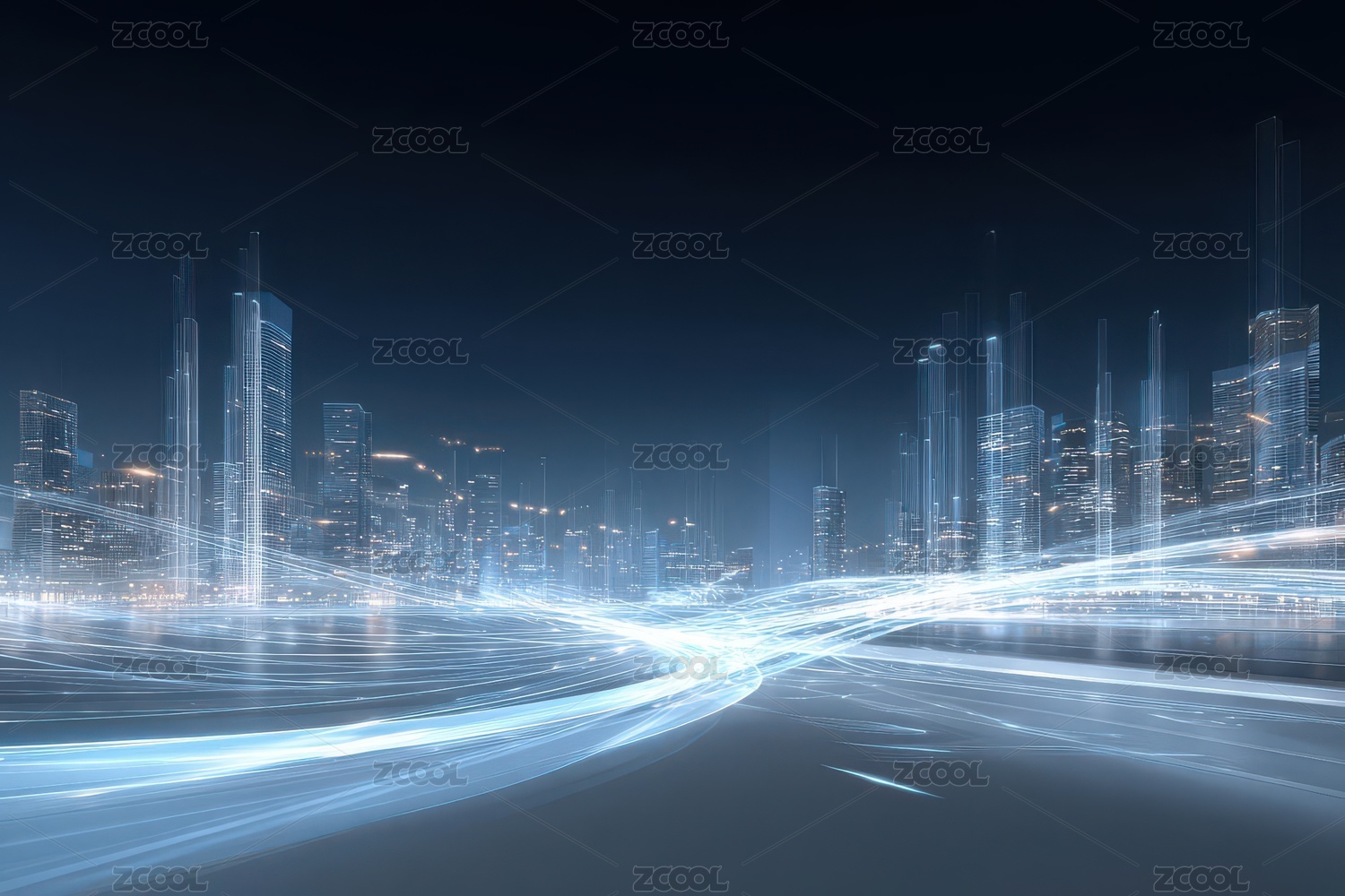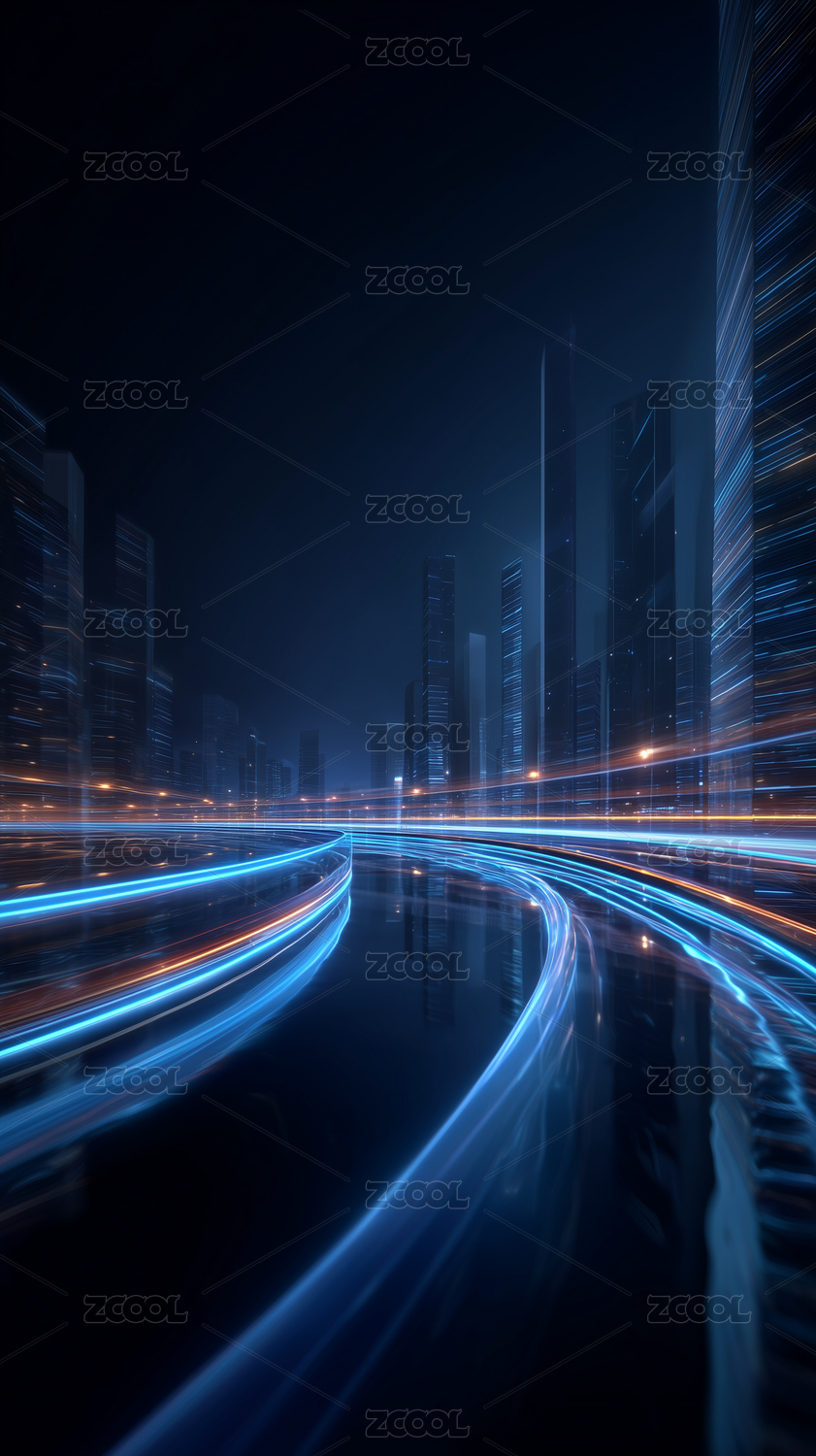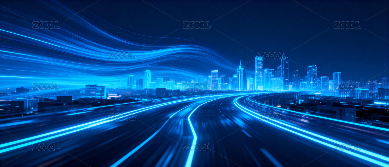 未来城市,科幻,高科技,城市天际线,蓝色灯光,高速公路,光轨,现代感,科技感,冷色调