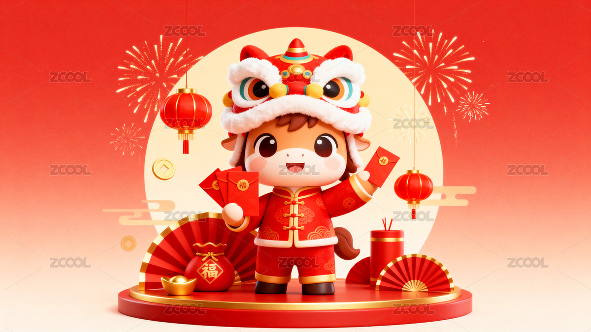 春节,卡通小牛,舞狮,中国灯笼,烟花,红包,金元宝,喜庆,传统服饰,节日装饰