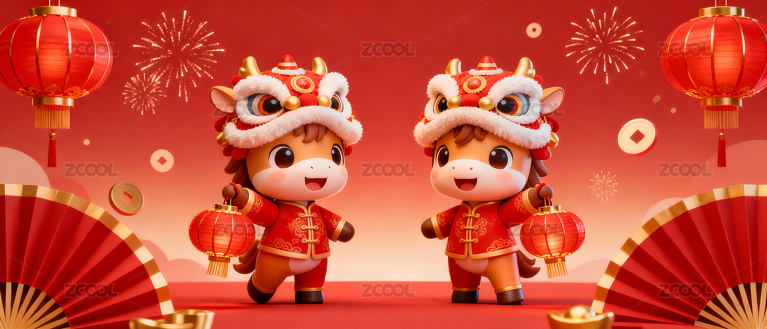春节,卡通小牛,舞狮,中国灯笼,烟花,红包,金元宝,喜庆,传统服饰,节日装饰