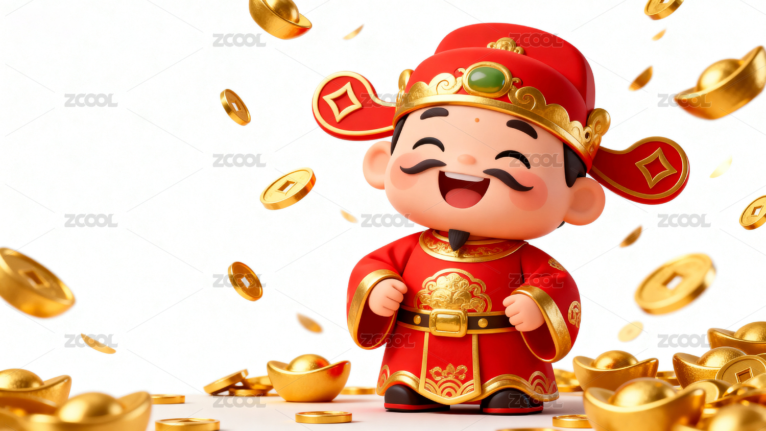 财神,云端,元宝,铜钱,传统服饰,春节,喜庆,好运,财富,卡通风格