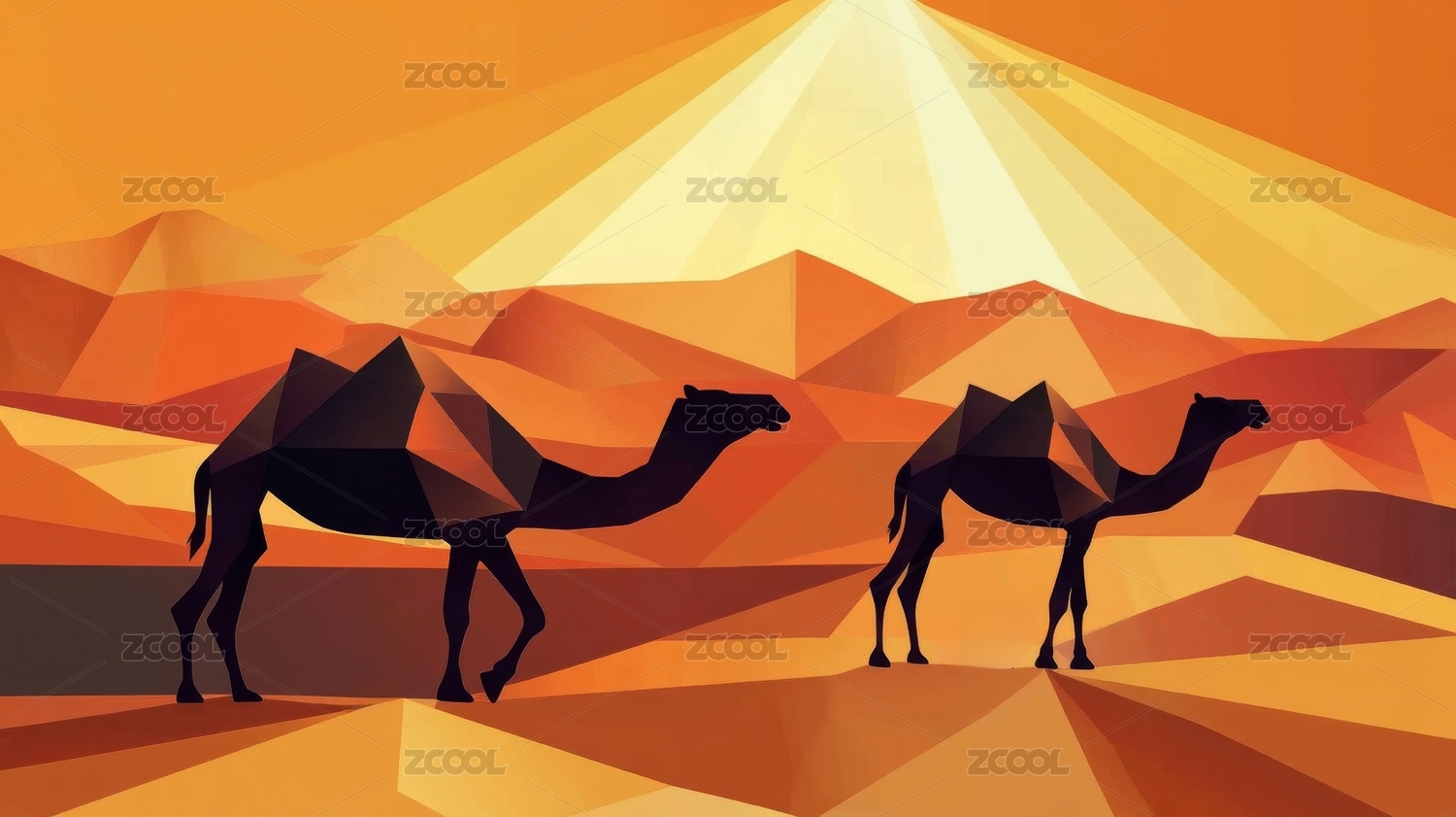 金字塔与沙漠驼队几何剪影