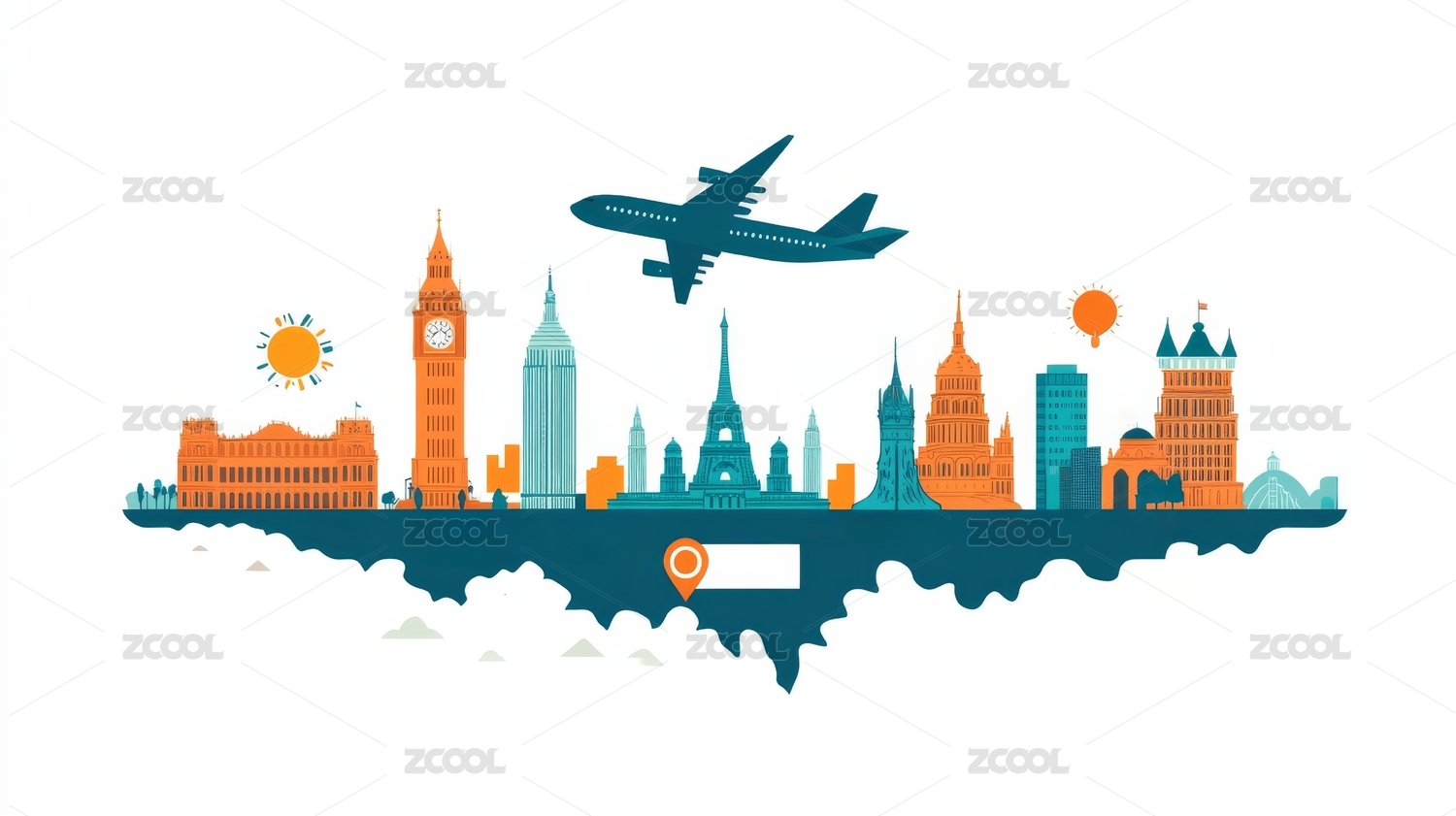 标志性地标和飞机彩色插图