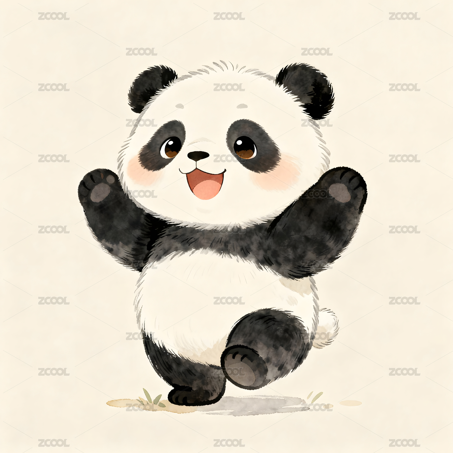 水墨插画风中国国宝吉祥物熊猫拿着竹子微笑