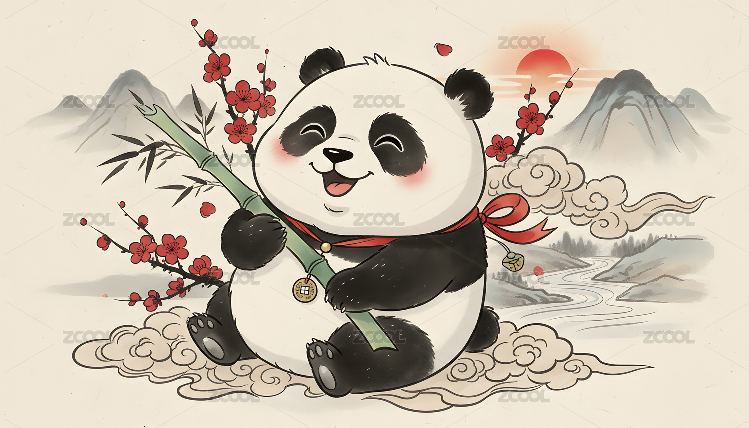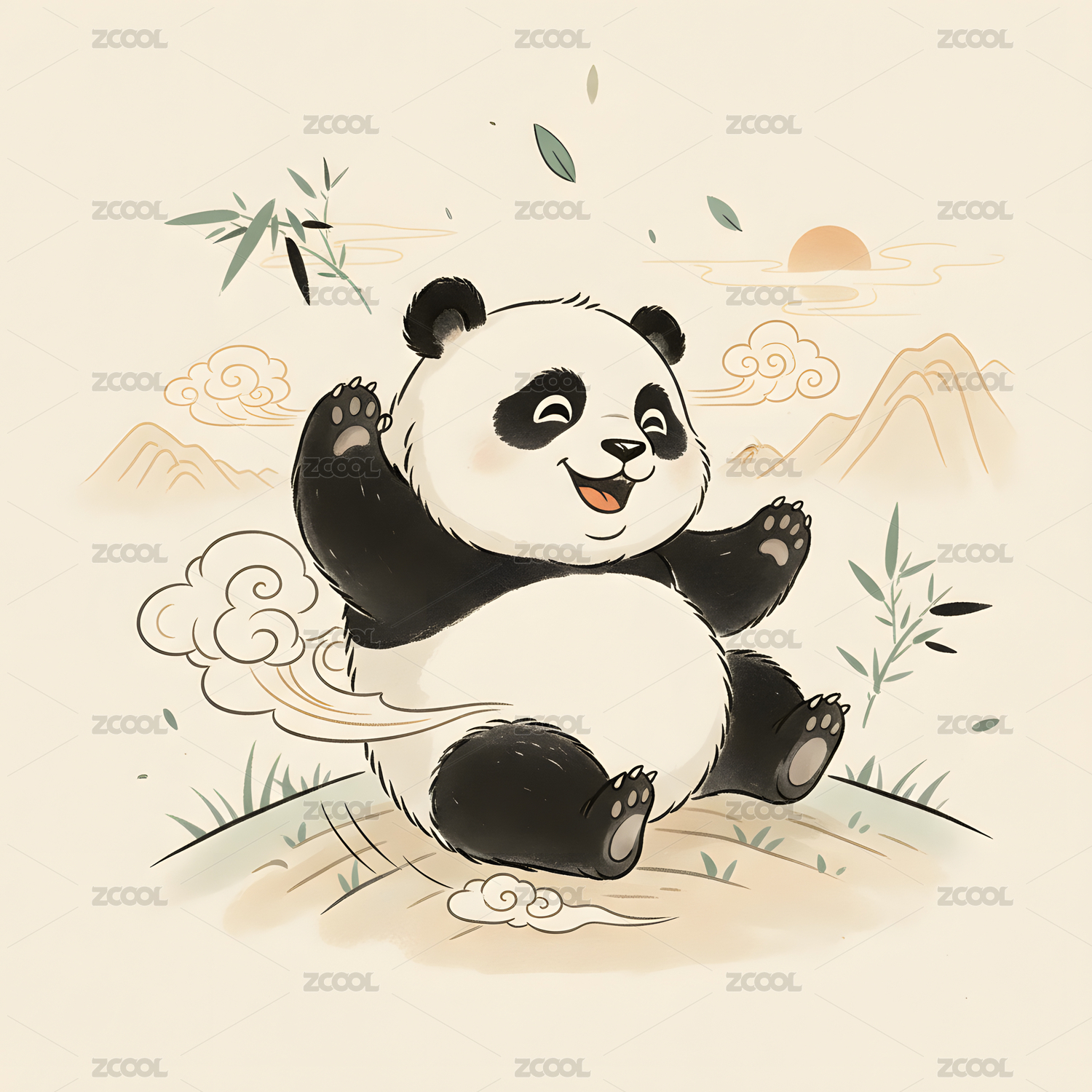 中国风,传统,可爱,熊猫,插画,平面,扁平,场景,户外,写意