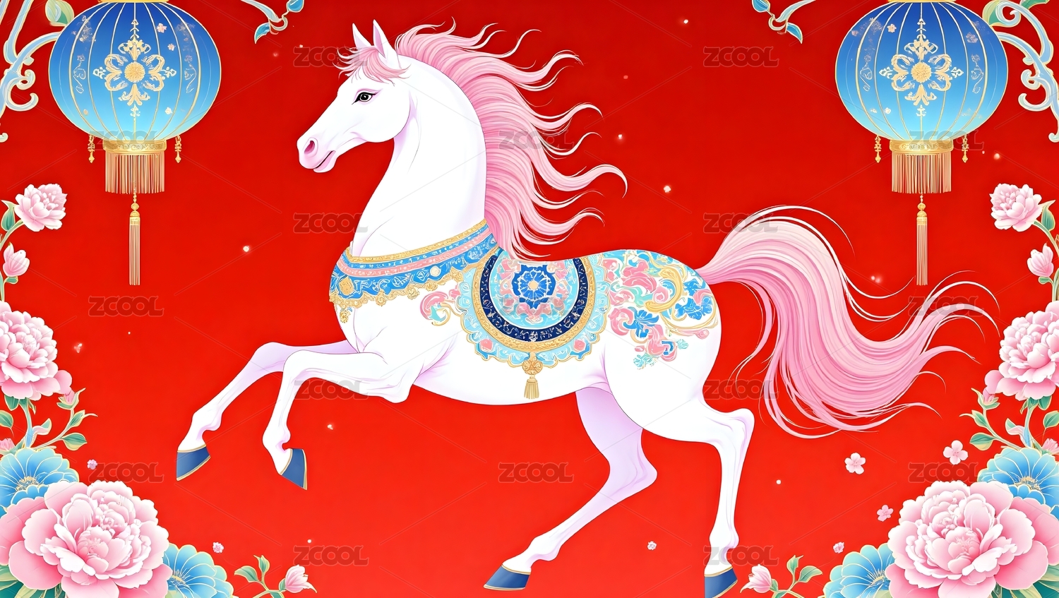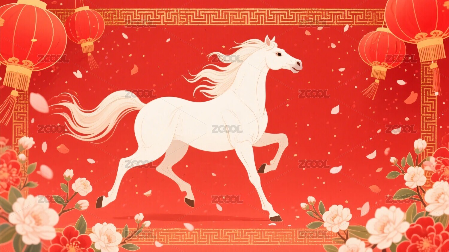 祥瑞白马路灯花卉背景