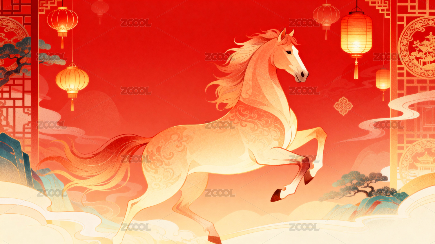 中国风马年插画新年喜庆背景