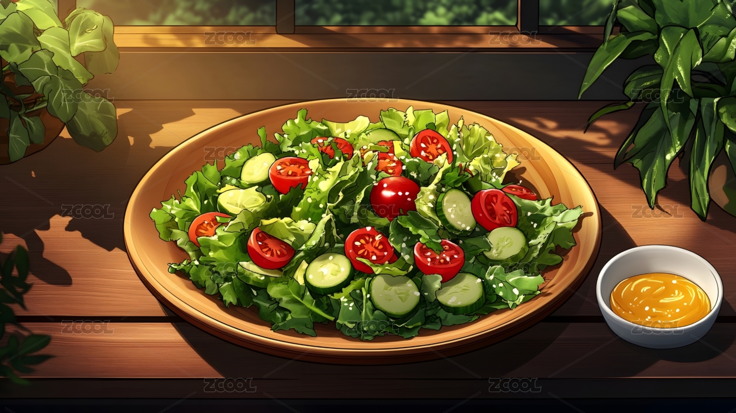 柔光下的蔬菜沙拉与蜂蜜芥末酱