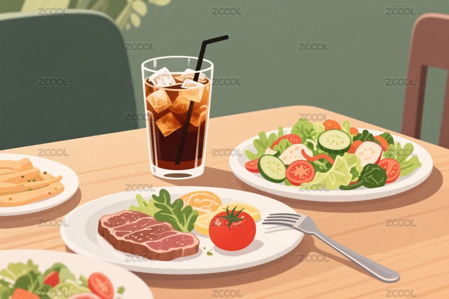 健康早餐美食沙拉俯视图健身餐鸡蛋面包插画