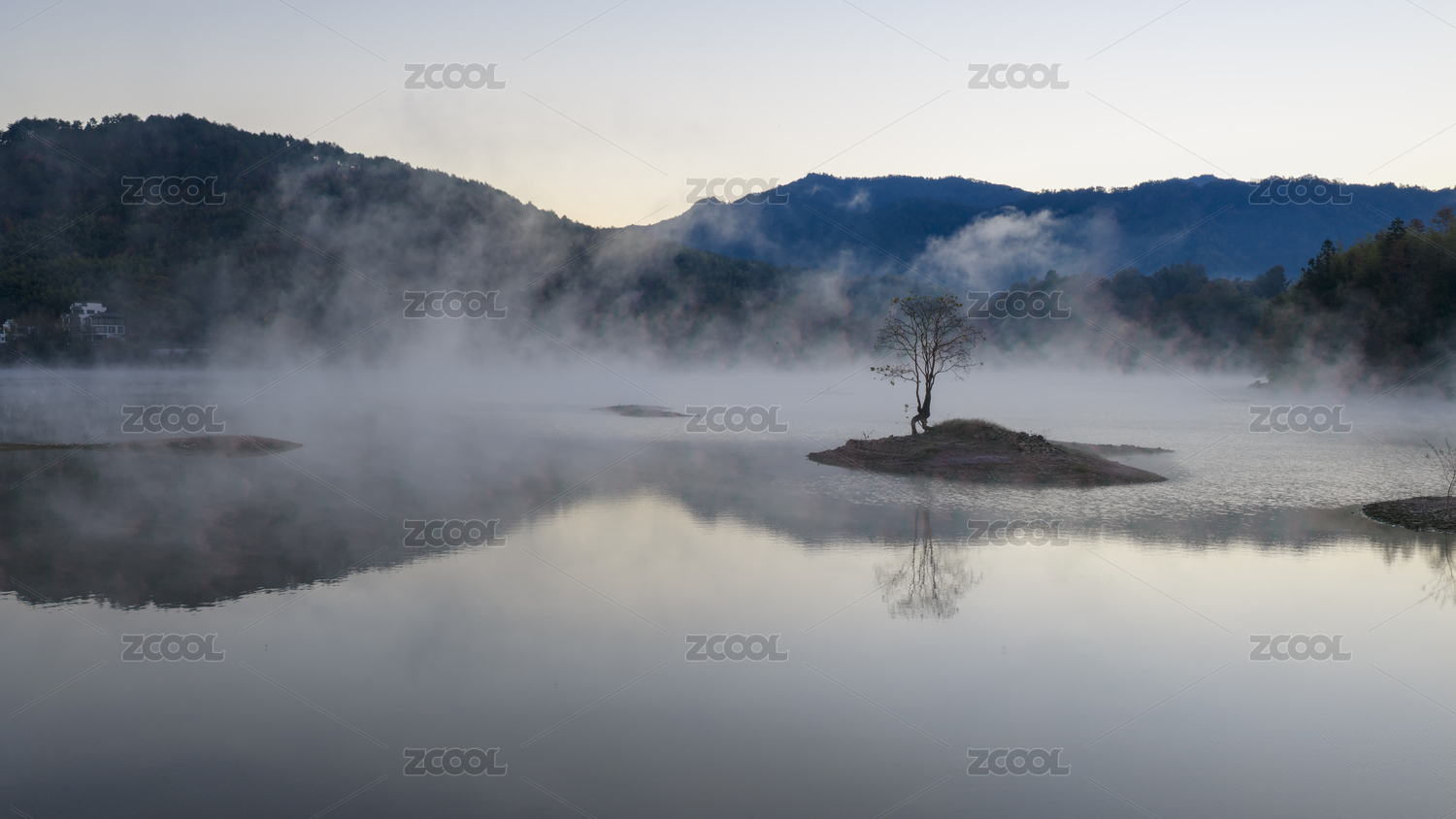 中国安徽省宣城泾县桃花潭风景区清晨江面薄雾飘渺的美景