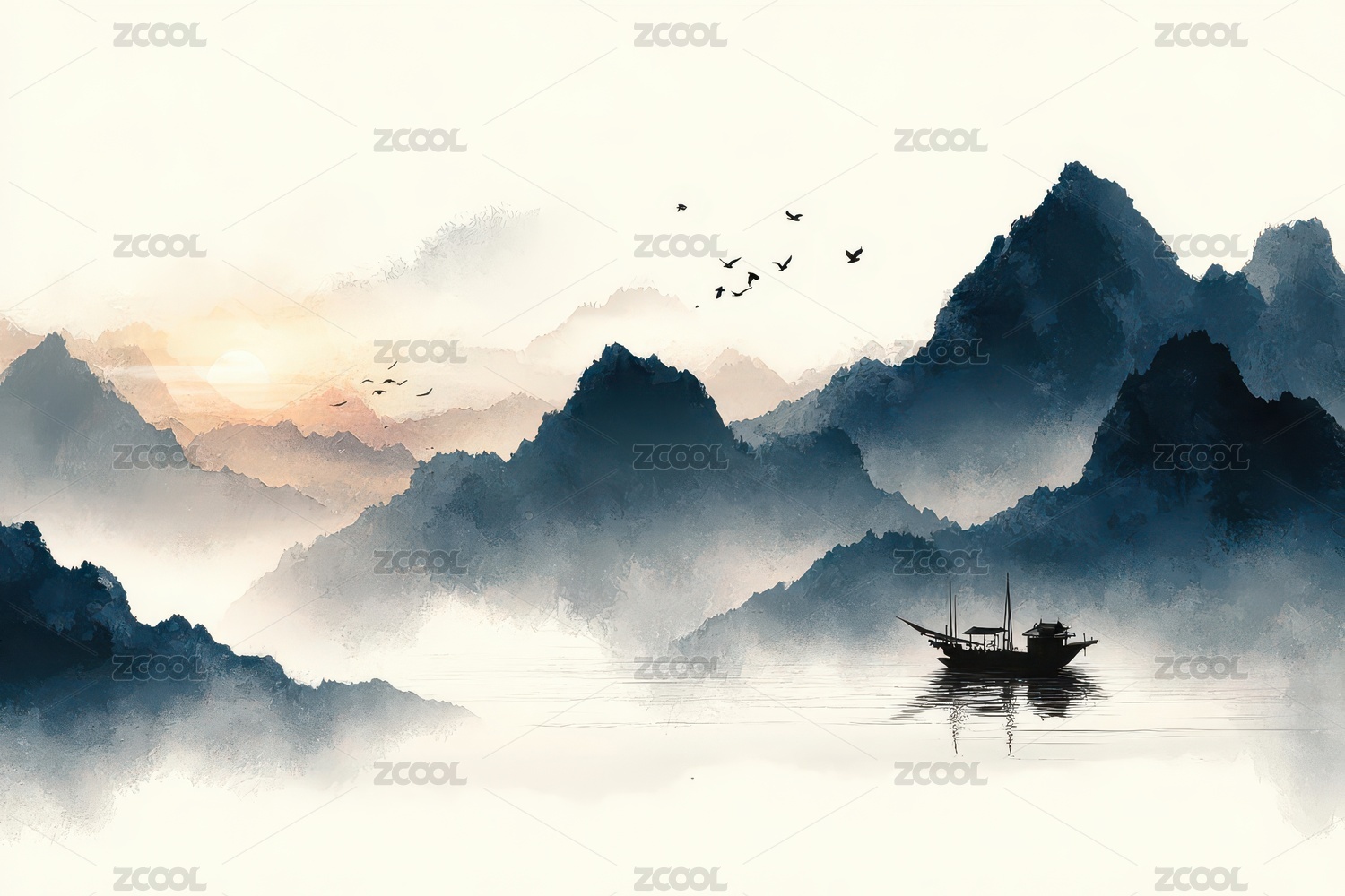 山水晨雾中的孤舟与飞鸟
