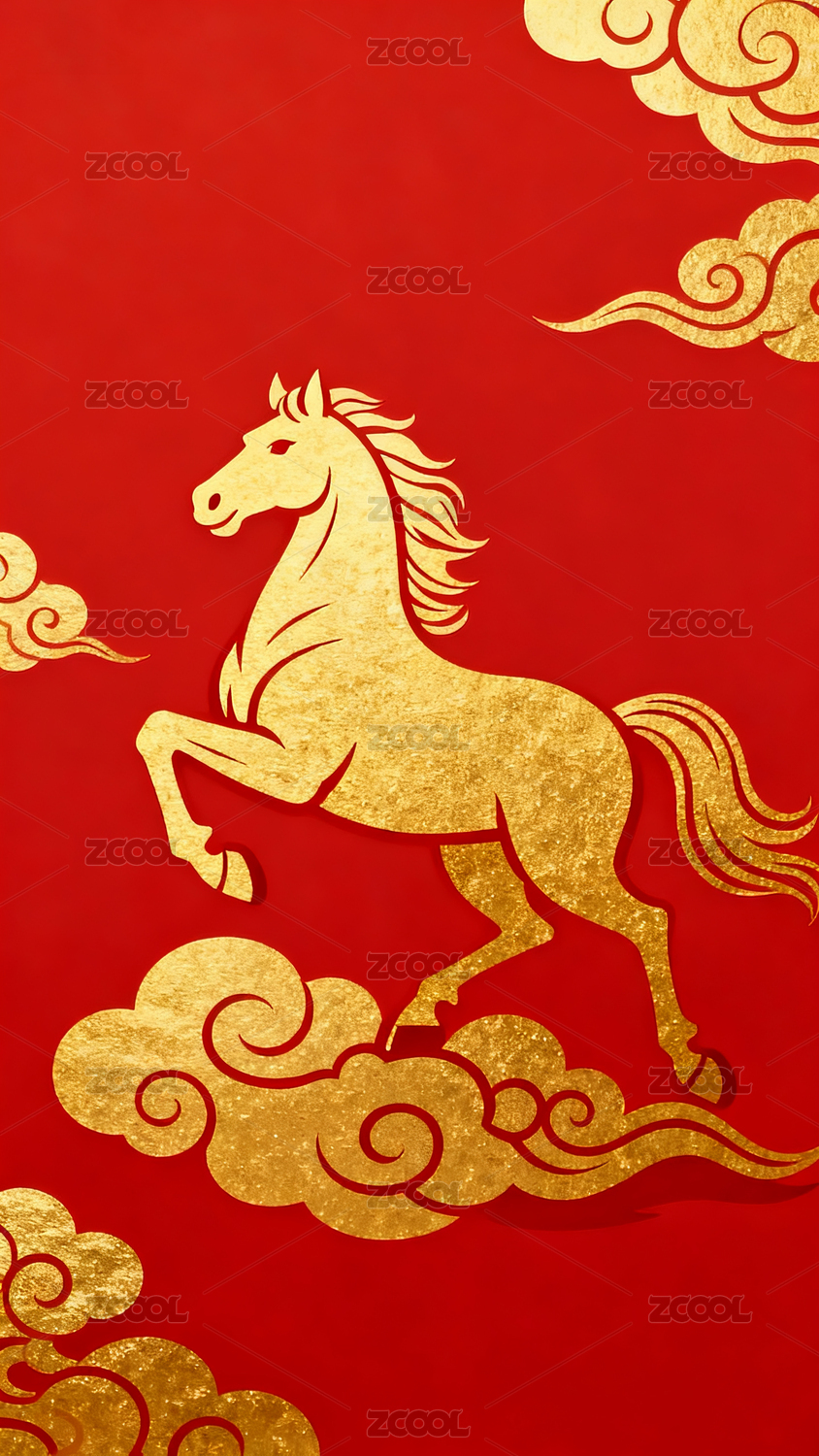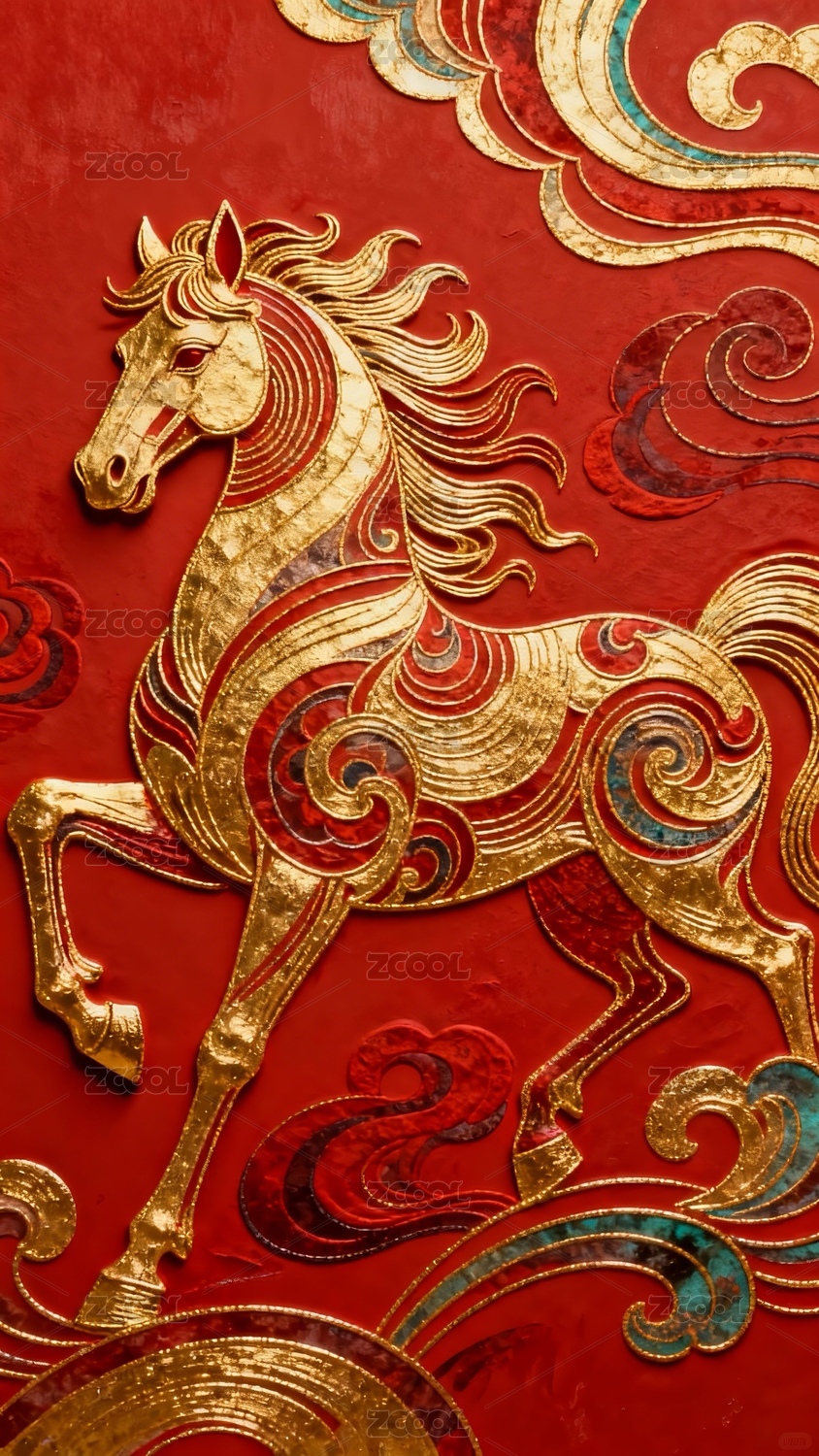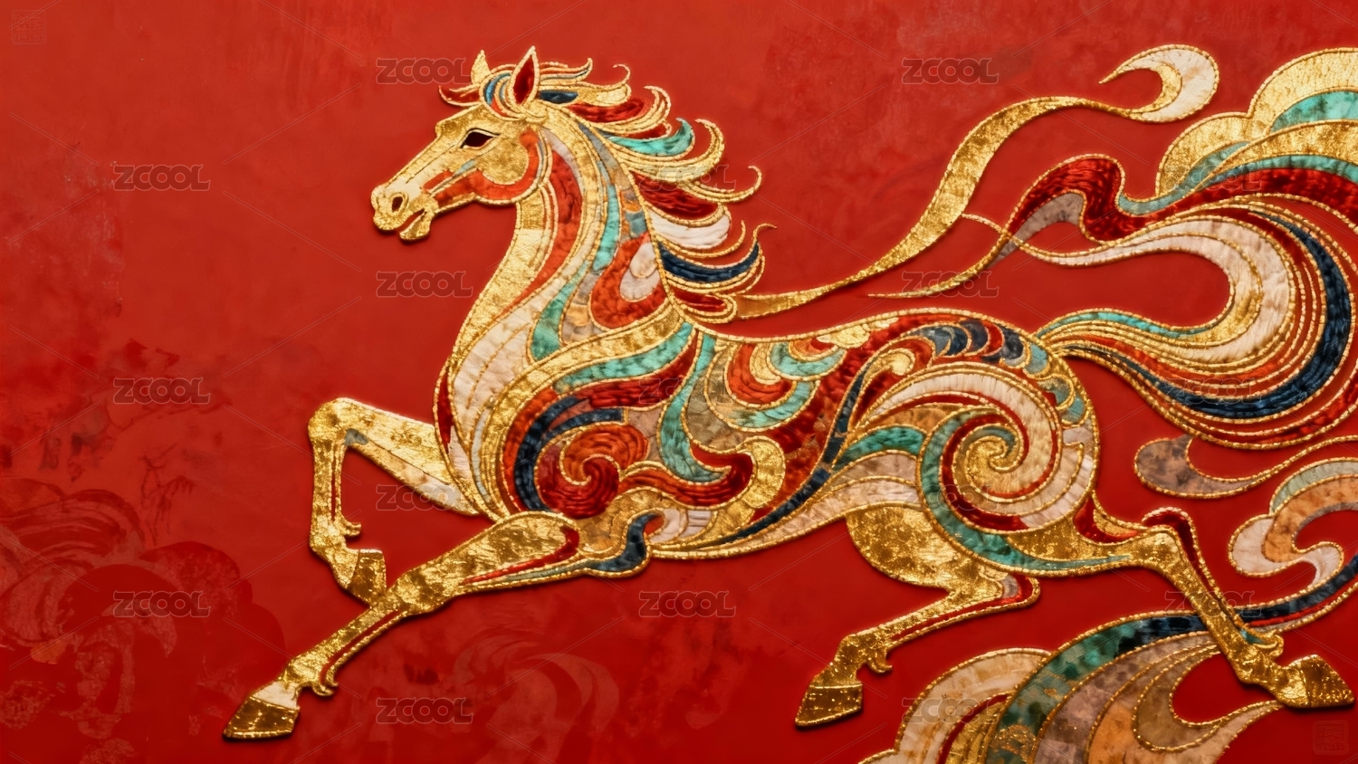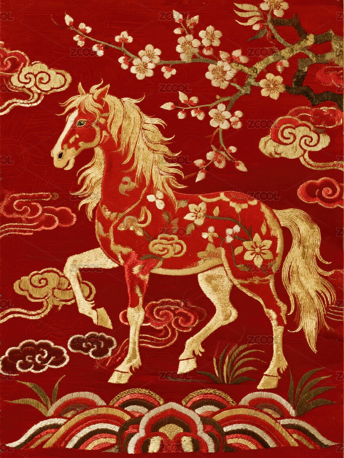 中国传统生肖马敦煌纹样红金配色金线刺绣