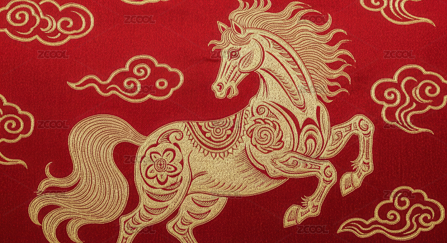 中国传统生肖马敦煌纹样红金配色金线刺绣