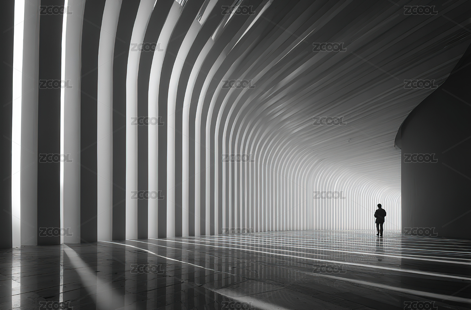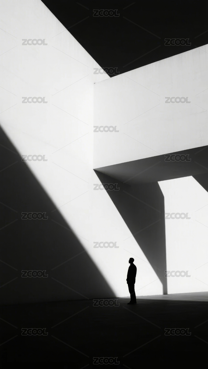 光影,几何空间,孤独,剪影,建筑内部,蓝色调,线条,空间感,氛围感,现代建筑