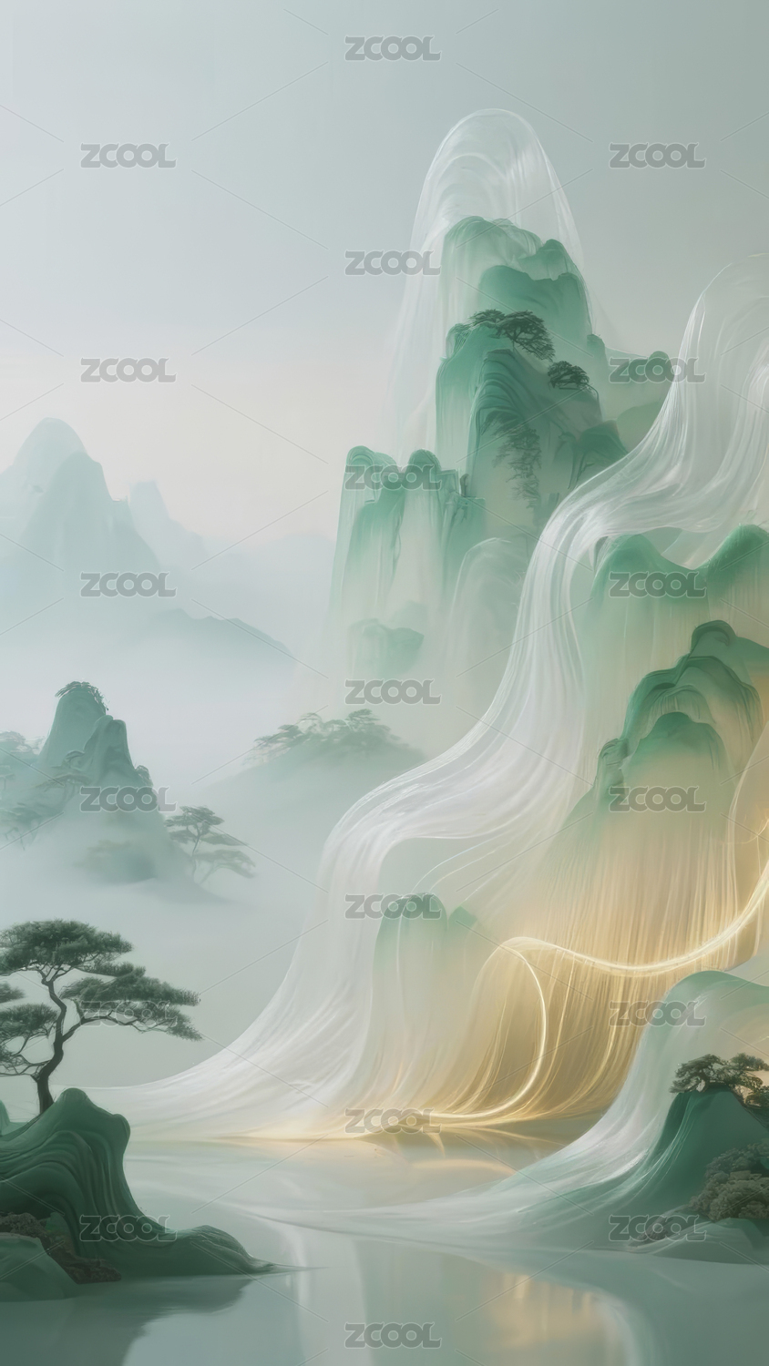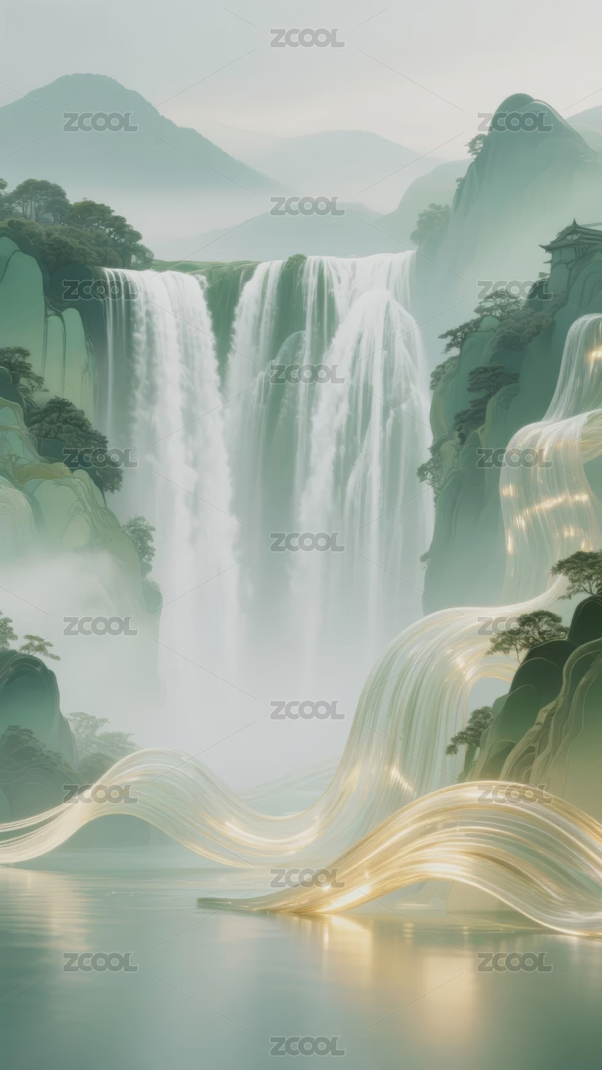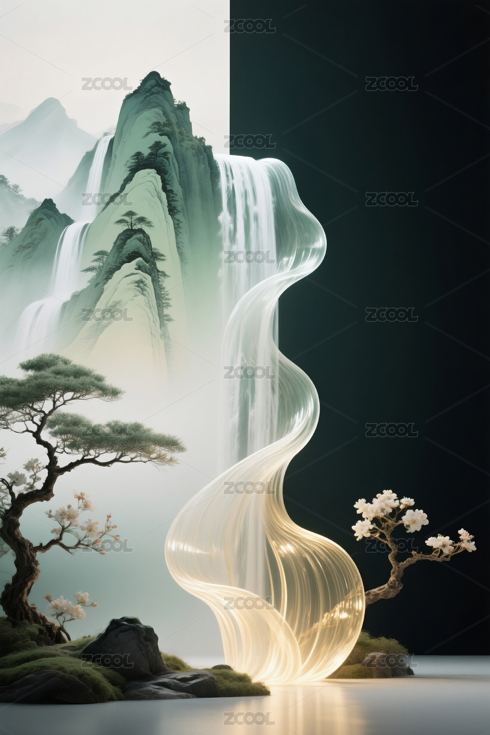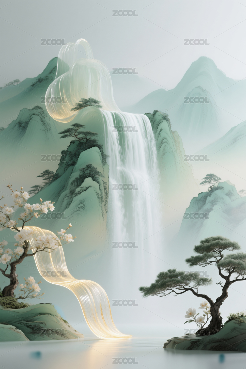 山水,瀑布,意境,国潮,光影,松树,山峰,云雾,禅意,水墨风