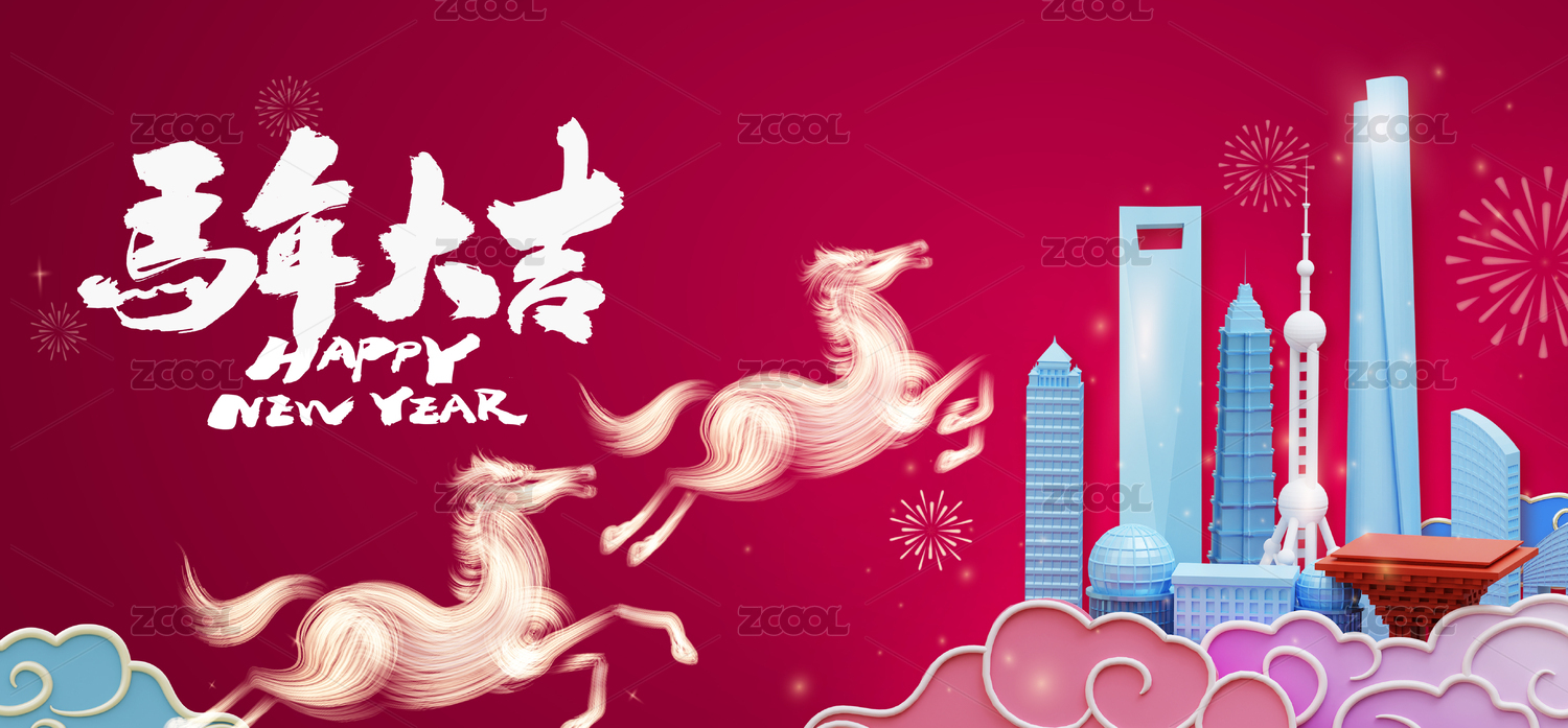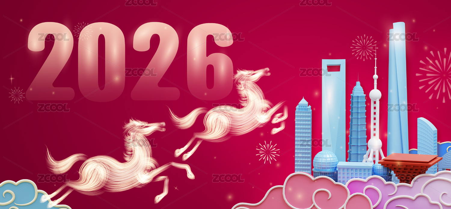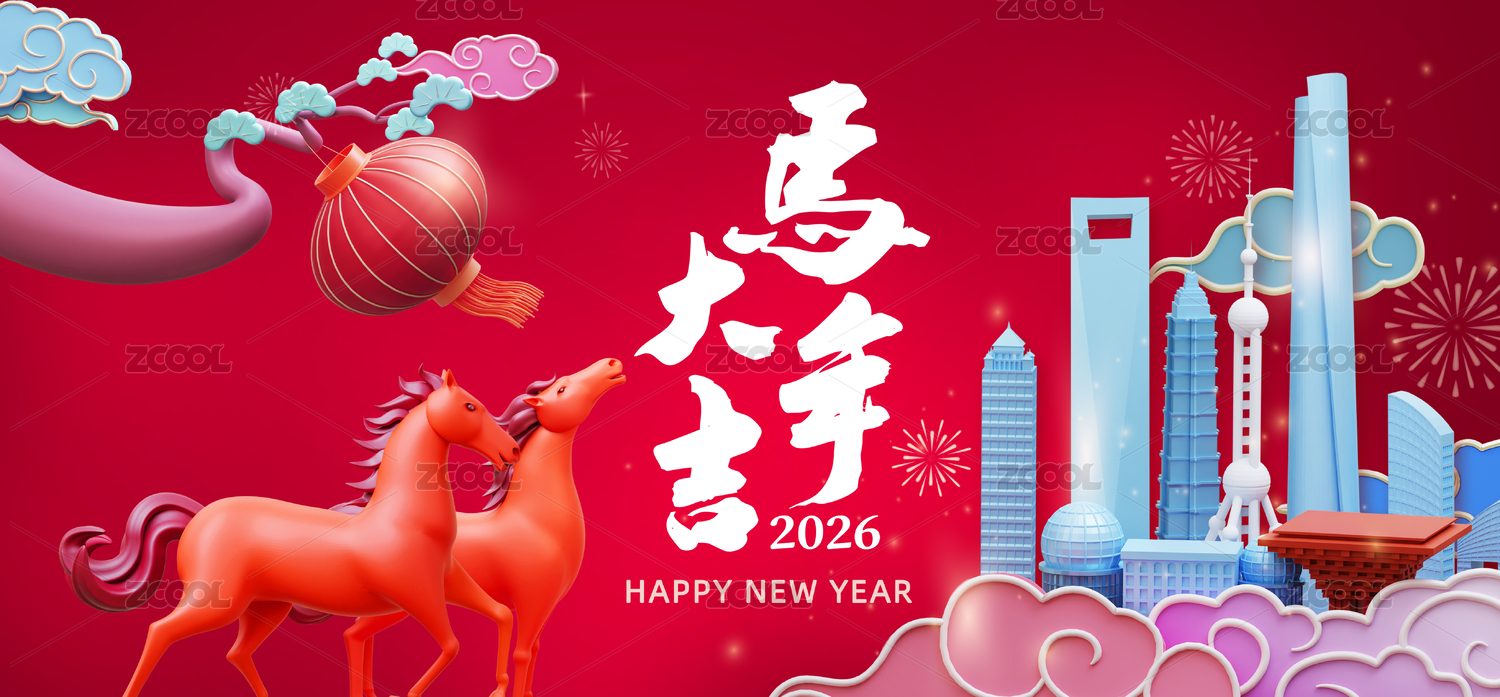 2026,马,马年,上海,中国,城市,地标,高楼,3D,奔跑