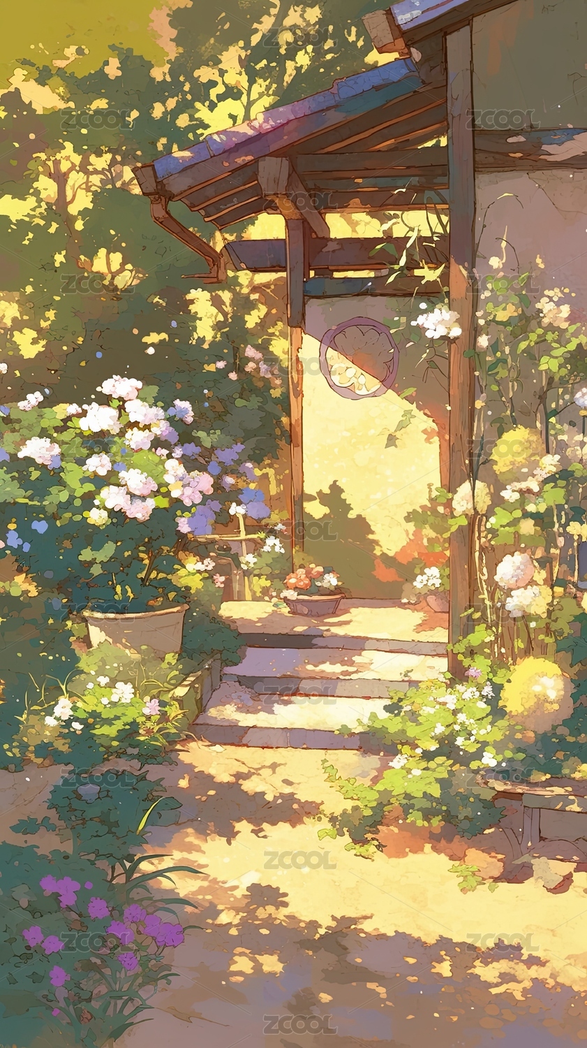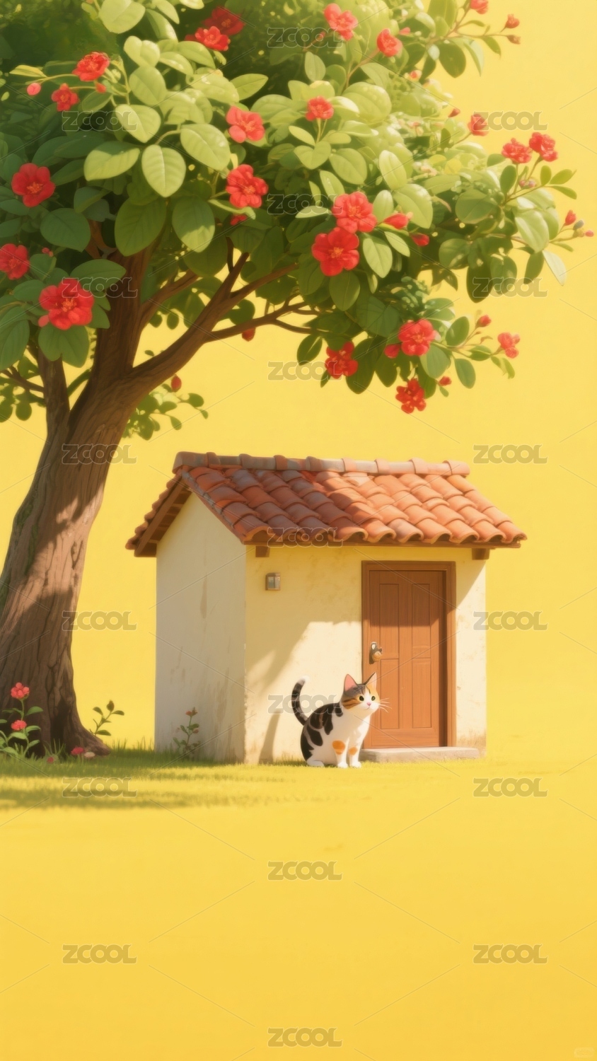 花朵,光影,插画,自然,树木,户外,宁静,色彩,建筑,小猫