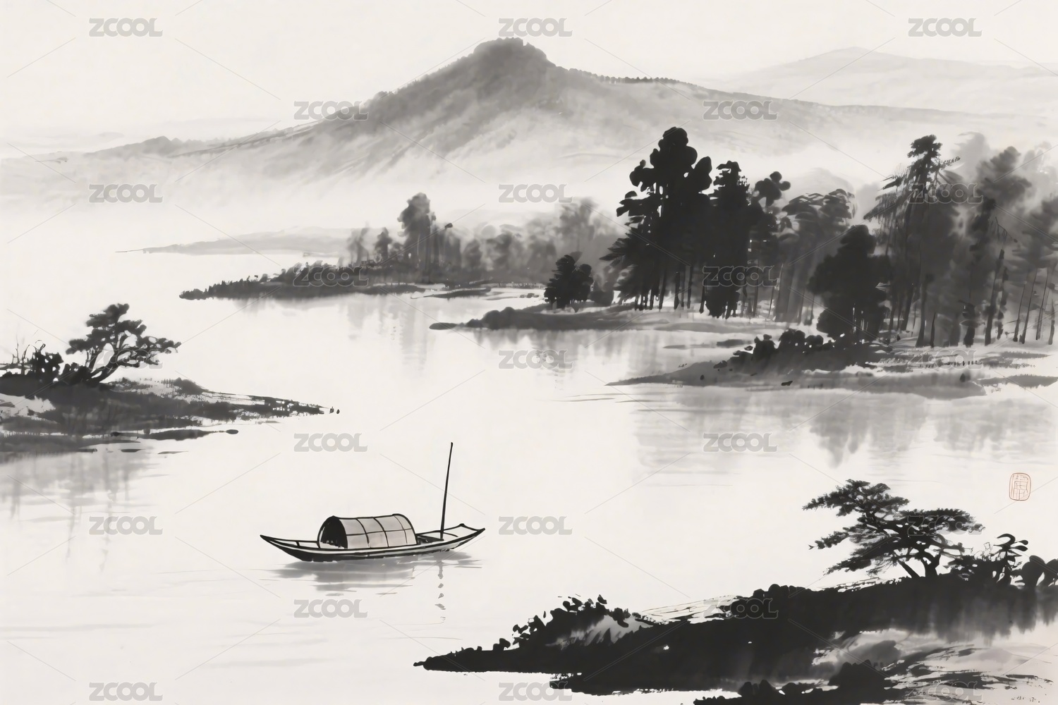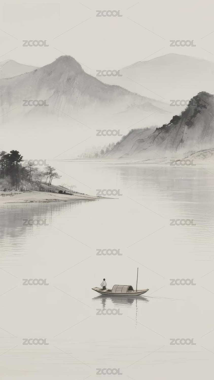 水墨山水江上小船图景
