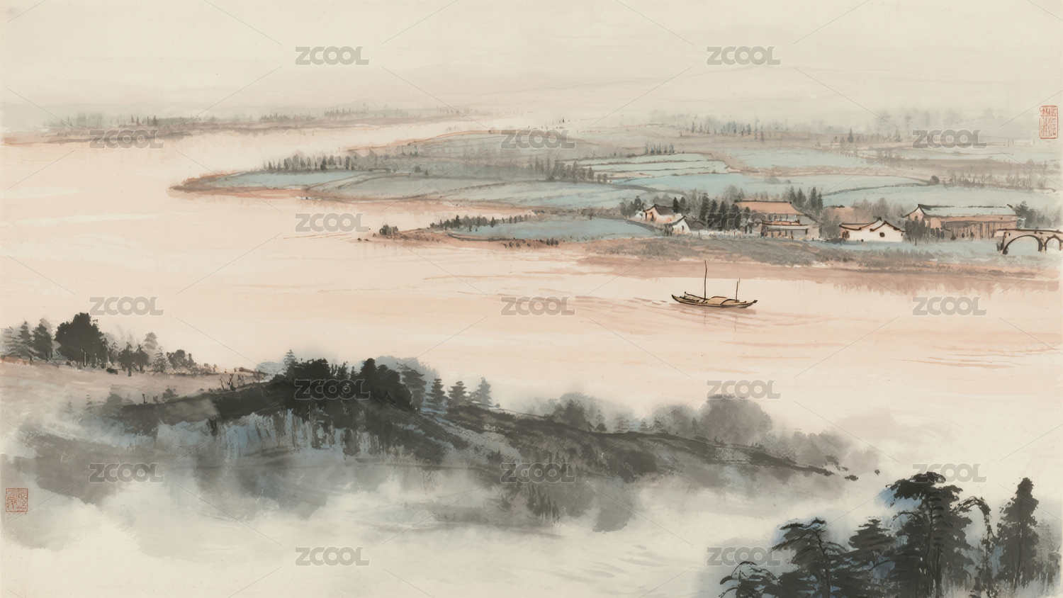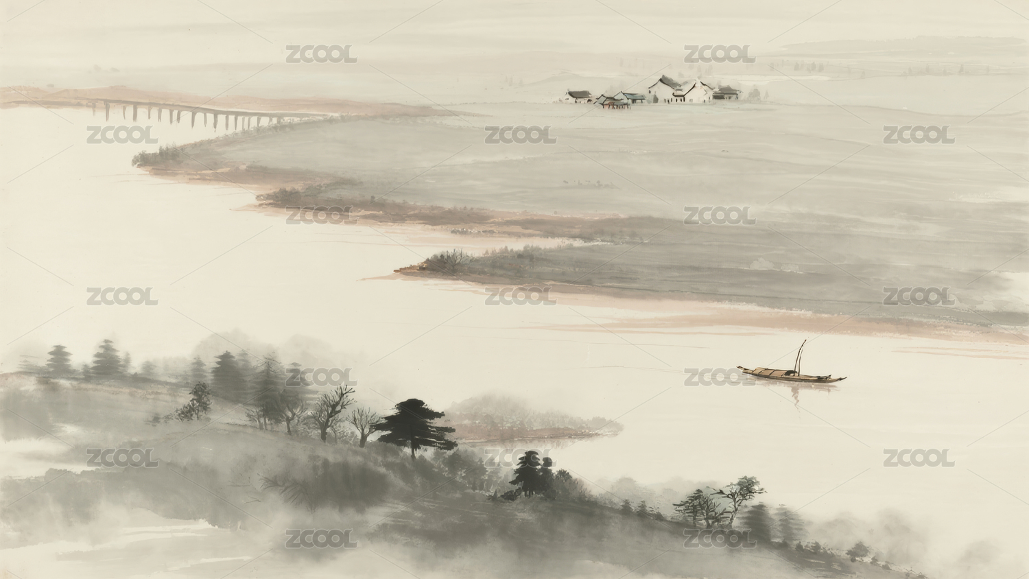 山水画中的江景与小舟