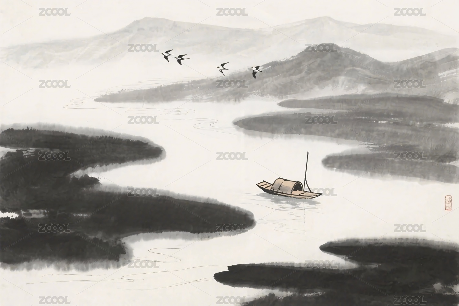 水墨山水小舟飞鸟