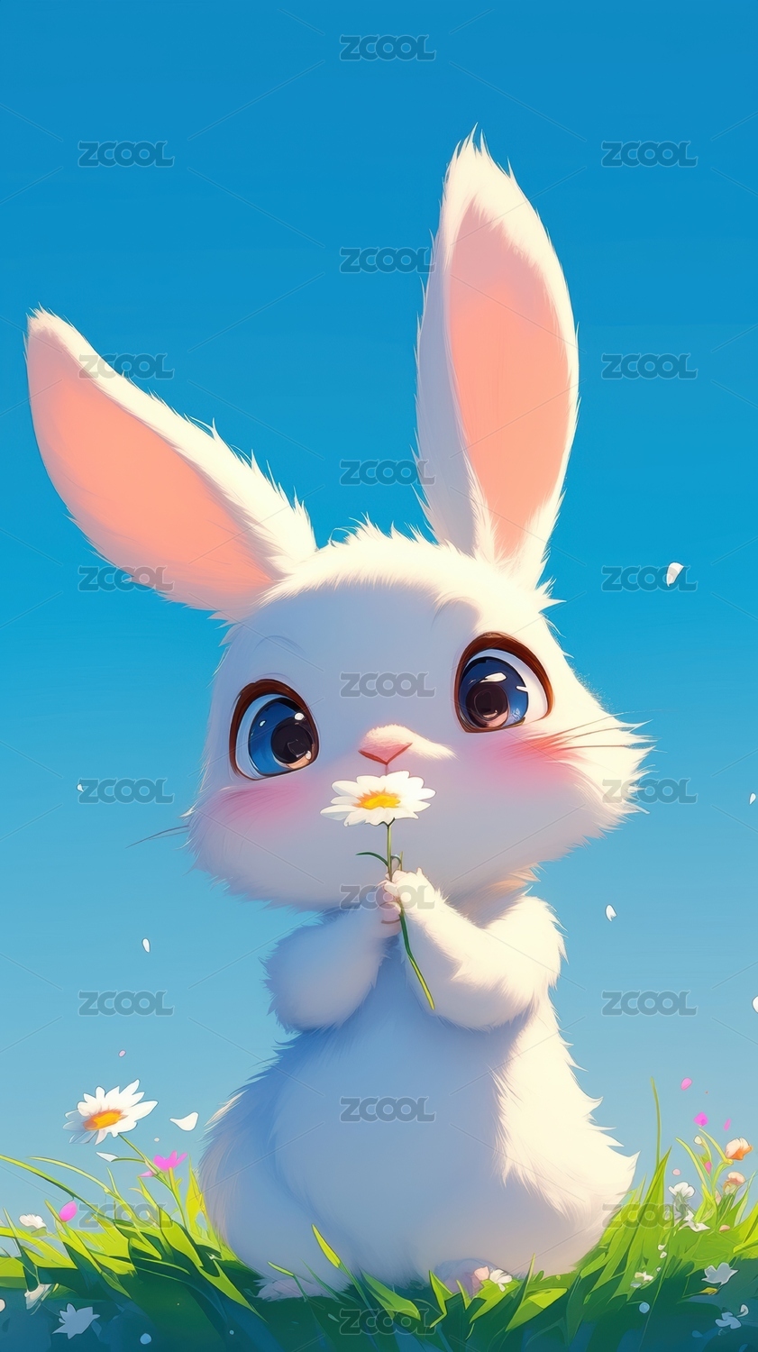 萌兔手持雏菊蓝天白云背景