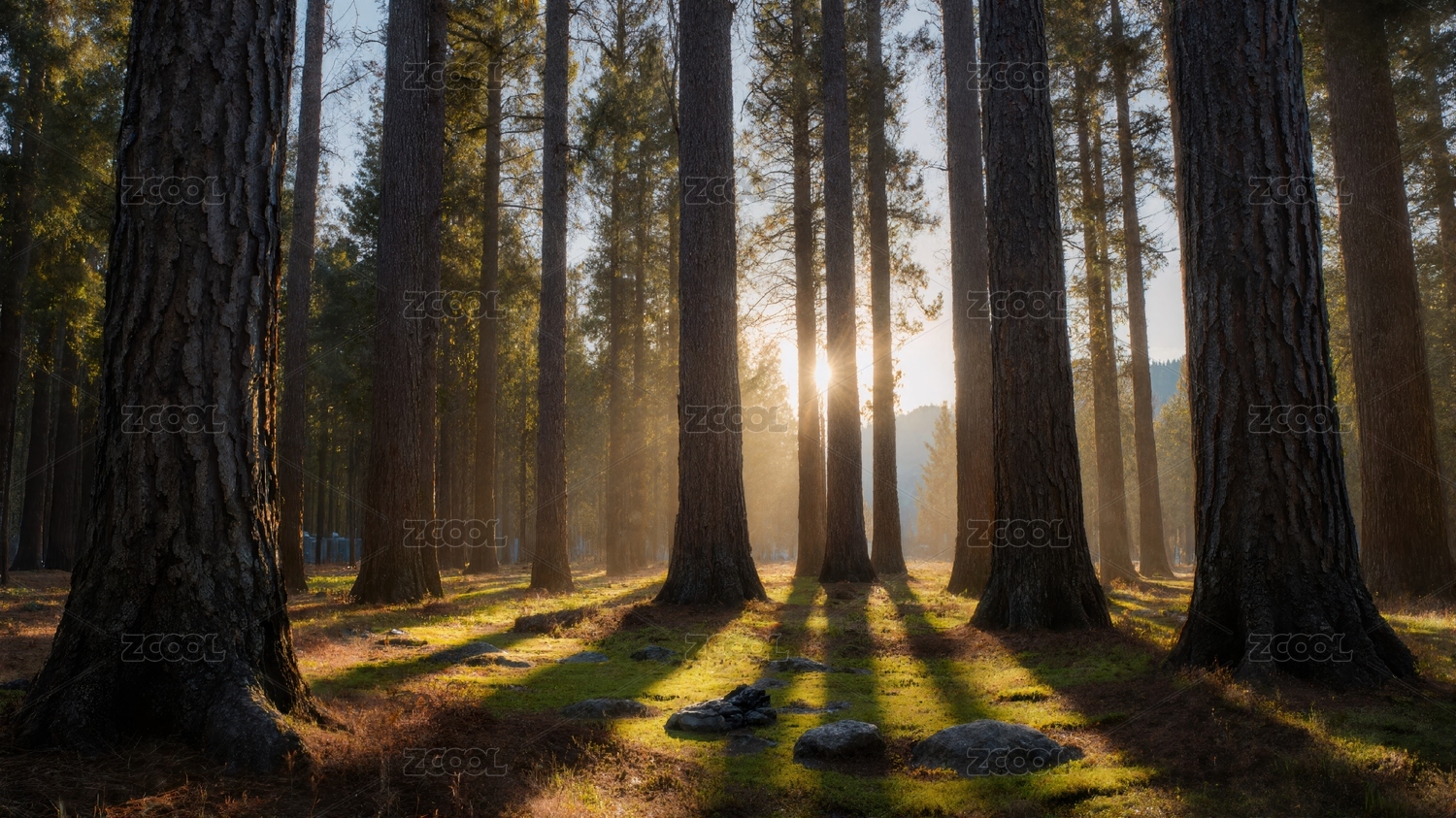 高大树木林间晨光穿透