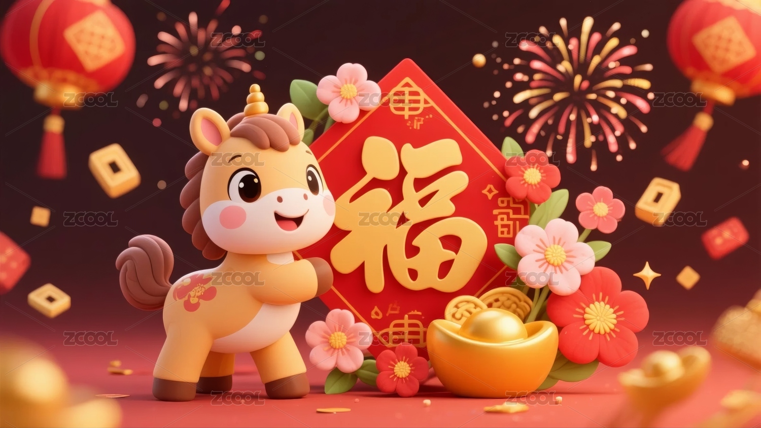 节日喜庆场景中的舞狮与小马马年喜庆的场景