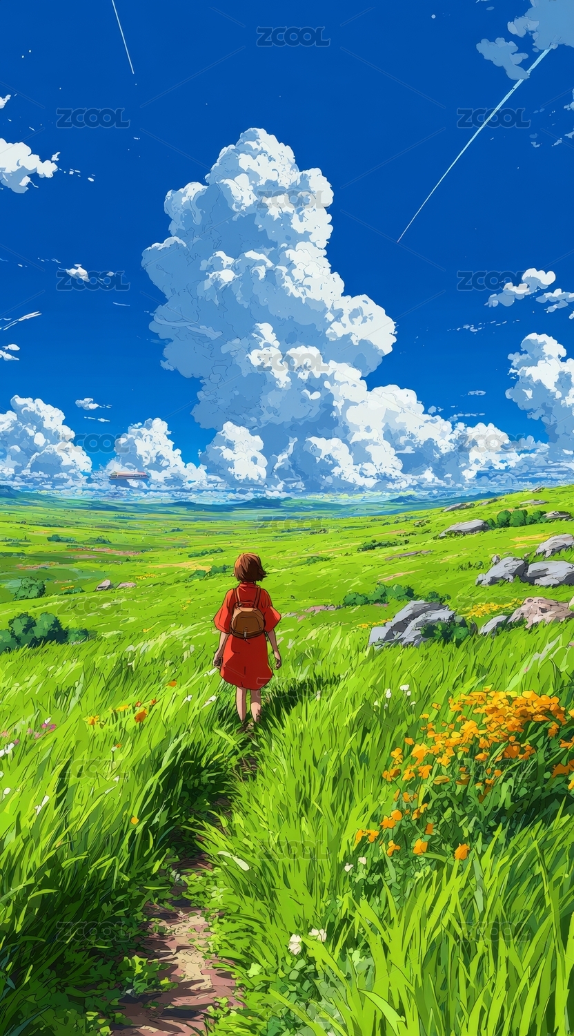 人物,宁静,自然,户外,传统服饰,清新,动态,花朵,草地,天空