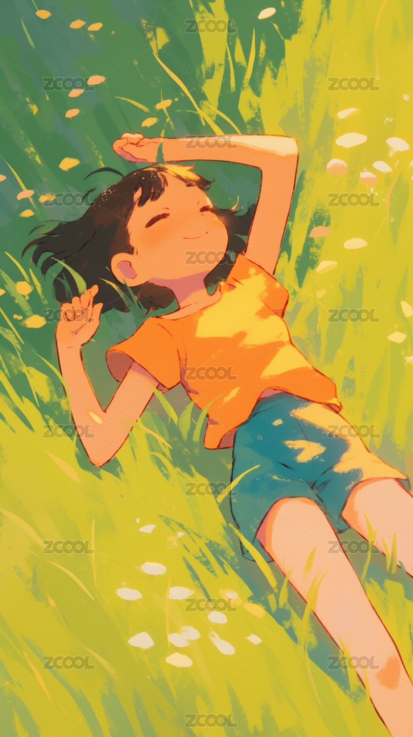 春天草地人物卡通插画